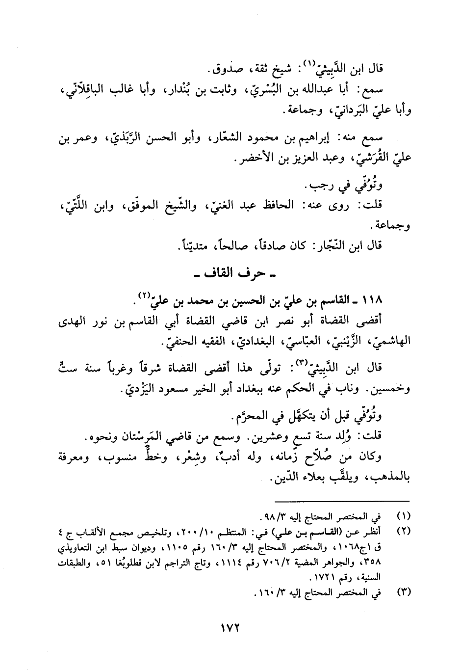 [2] انظر عن (القاسم بن علي) في: المنتظم 10/ 200، وتلخيص مجمع الألقاب ج 4 ق 1 ج 1068، والمختصر المحتاج إليه 3/ 160 رقم 1105، وديوان سبط ابن التعاويذي 358، والجواهر المضية 2/ 706 رقم 1114، وتاج التراجم لابن قطلوبغا 51، والطبقات السنية، رقم 1721.