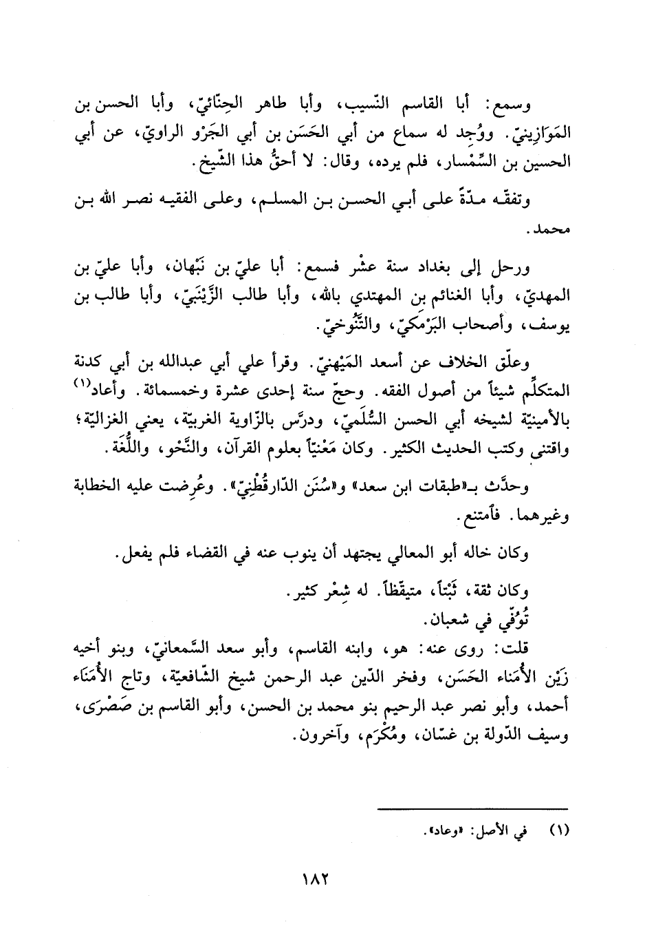 وعلّق الخلاف عَنْ أسعد المَيْهنيّ. وقرأ علي أَبِي عَبْد اللَّه بْن أَبِي كدنة المتكلَّم شيئا من أصول الفقه. وحجّ سنة إحدى عشرة وخمسمائة. وأعاد [1] بالأمينيَّة لشيخه أَبِي الْحَسَن السُّلَميّ، ودرَّس بالزّاوية الغربيَّة، يعني الغزاليَّة، واقتنى وكتب الحديث الكثير. وكان مَعْنيًّا بعلوم القرآن، والنَّحْو، واللُّغَة.