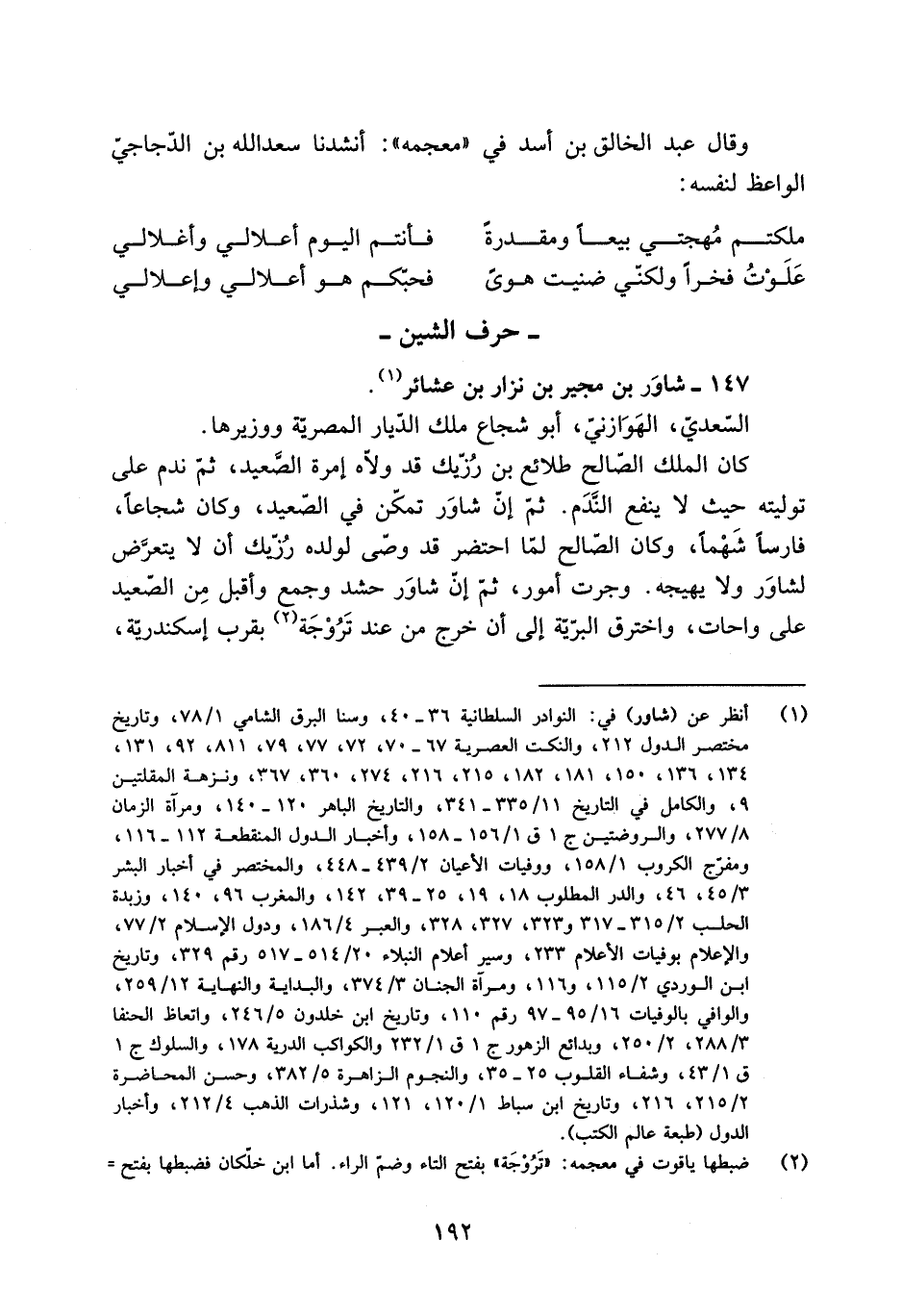 [1] انظر عن (شاور) في: النوادر السلطانية 36- 40، وسنا البرق الشامي 1/ 78، وتاريخ مختصر الدول 212، والنكت العصرية 67- 70، 72، 77، 79، 811، 92، 131، 134، 136، 150، 181، 182، 215، 216، 274، 360، 367، ونزهة المقلتين 9، والكامل في التاريخ 11/ 335- 341، والتاريخ الباهر 120- 140، ومرآة الزمان 8/ 277، والروضتين ج 1 ق 1/ 156- 158، وأخبار الدول المنقطعة 112- 116، ومفرّج الكروب 1/ 158، ووفيات الأعيان 2/ 439- 448، والمختصر في أخبار البشر 3/ 45، 46، والدر المطلوب 18، 19، 25- 39، 142، والمغرب 96، 140، وزبدة الحلب 2/ 315- 317 و 323، 327، 328، والعبر 4/ 186، ودول الإسلام 2/ 77، والإعلام بوفيات الأعلام 233، وسير أعلام النبلاء 20/ 514- 517 رقم 329، وتاريخ ابن الوردي 2/ 115، و 116، ومرآة الجنان 3/ 374، والبداية والنهاية 12/ 259، والوافي بالوفيات 16/ 95- 97 رقم 110، وتاريخ ابن خلدون 5/ 246، واتعاظ الحنفا 3/ 288، 2/ 250، وبدائع الزهور ج 1 ق 1/ 232 والكواكب الدرية 178، والسلوك ج 1 ق 1/ 43، وشفاء القلوب 25- 35، والنجوم الزاهرة 5/ 382، وحسن المحاضرة 2/ 215، 216، وتاريخ ابن سباط 1/ 120، 121، وشذرات الذهب 4/ 212، وأخبار الدول (طبعة عالم الكتب) .