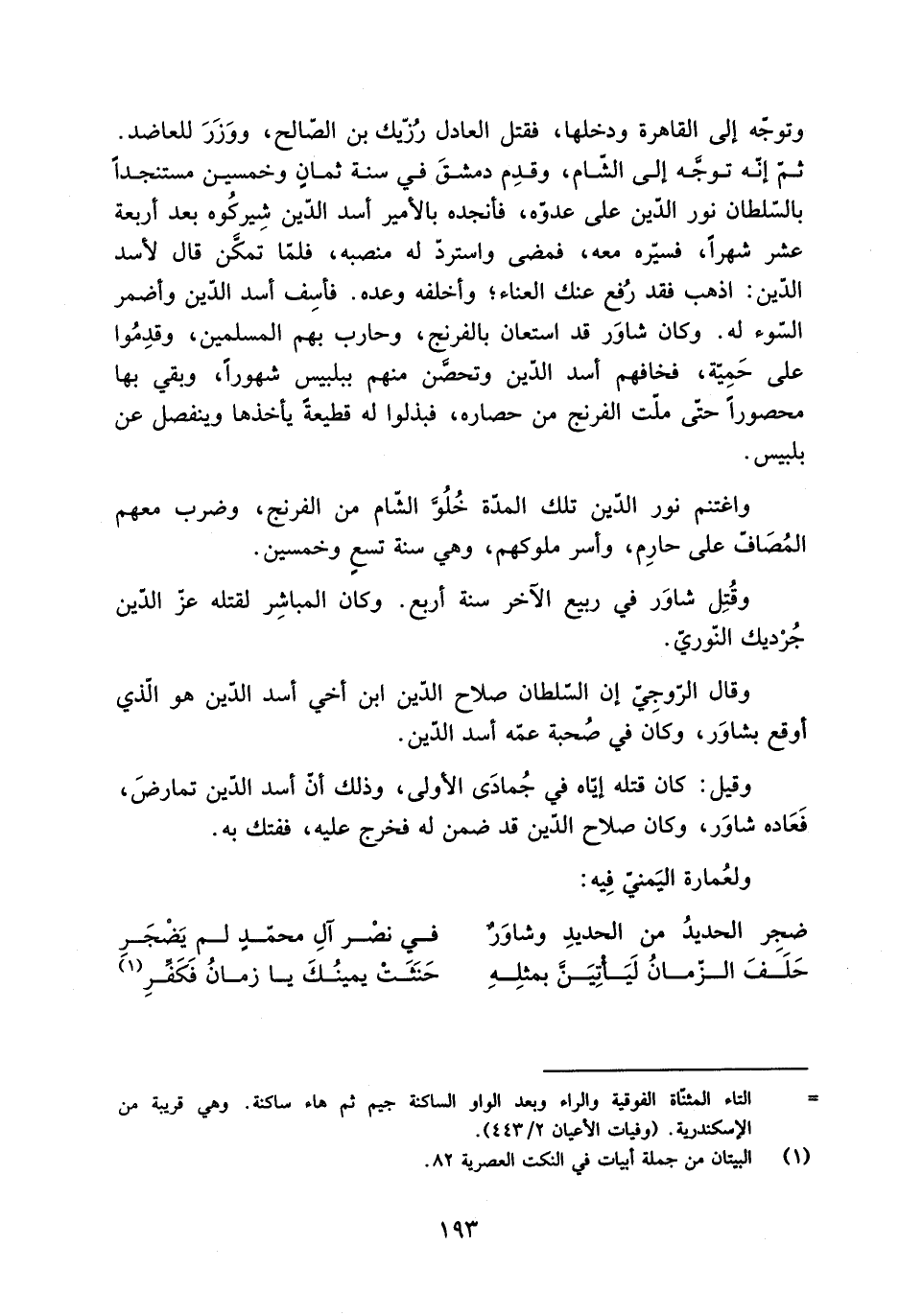 ثمّ إنّه توجَّه إلى الشّام، وقدِم دمشقَ فِي سنة ثمانٍ وخمسين مستنجدا بالسّلطان نور الدّين عَلَى عدوّه، فأنجده بالأمير أسد الدّين شير كوه بعد أربعة عشر شهرا، فسيّره معه، فمضى واستردّ لَهُ منصبه، فلمّا تمكَّن قَالَ لأسد الدّين: اذهب فقد رُفع عنك العناء، وأخلفه وعده. فأسِف أسد الدّين وأضمر السّوء لَهُ. وكان شاوَر قد استعان بالفرنج، وحارب بهم المسلمين، وقدِمُوا عَلَى حَمِيَّة، فخافهم أسد الدّين وتحصَّن منهم ببلبيس شهورا، وبقي بها محصورا حتّى ملّت الفرنج من حصاره، فبذلوا لَهُ قطيعة يأخذها وينفصل عَنْ بلبيس.