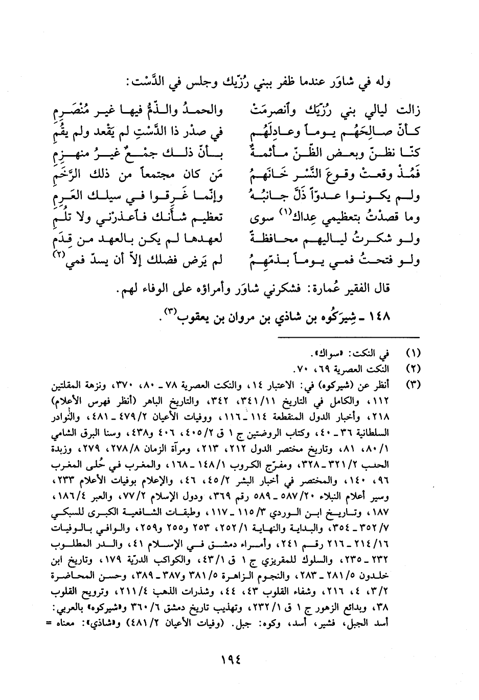 [3] انظر عن (شير كوه) في: الاعتبار 14، والنكت العصرية 78- 80، 370، ونزهة المقلتين 112، والكامل في التاريخ 11/ 341، 342، والتاريخ الباهر (انظر فهرس الأعلام) 218، وأخبار الدول المنقطعة 114- 116، ووفيات الأعيان 2/ 479- 481، والنوادر السلطانية 36- 40، وكتاب الروضتين ج 1 ق 2/ 405، 406 و 438، وسنا البرق الشامي 1/ 80، 81، وتاريخ مختصر الدول 212، 213، ومرآة الزمان 8/ 278، 279، وزبدة الحلب 2/ 321- 328، ومفرّج الكروب 1/ 148- 168، والمغرب في حلى المغرب 96، 140، والمختصر في أخبار البشر 2/ 45، 46، والإعلام بوفيات الأعلام 233، وسير أعلام النبلاء 20/ 587- 589 رقم 369، ودول الإسلام 2/ 77، والعبر 4/ 186، 187، وتاريخ ابن الوردي 3/ 115- 117، وطبقات الشافعية الكبرى للسبكي 7/ 352- 354، والبداية والنهاية 1/ 252، 253 و 255 و 259، والوافي بالوفيات 16/ 214- 216 رقم 241، وأمراء دمشق في الإسلام 41، والدر المطلوب 232- 235، والسلوك للمقريزي ج 1 ق 1/ 43، والكواكب الدرّية 179، وتاريخ ابن خلدون 5/ 281- 283، والنجوم الزاهرة 5/ 381 و 387- 389، وحسن المحاضرة 2/ 3، 4، 216، وشفاء القلوب 43، 44، وشذرات الذهب 4/ 211، وترويح القلوب 38، وبدائع الزهور ج 1 ق 1/ 232، وتهذيب تاريخ دمشق 6/ 360 و «شير كوه» بالعربي:
