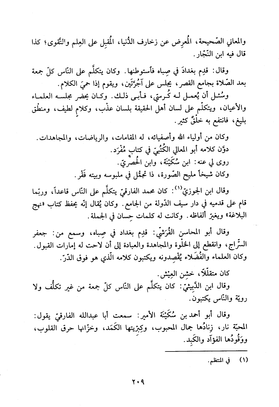 والمعاني الصّحيحة، المُعرِض عَنْ زخارف الدُّنيا، المُقبِل عَلَى العِلم والتَّقوى، كذا قَالَ فِيهِ ابن النّجّار.