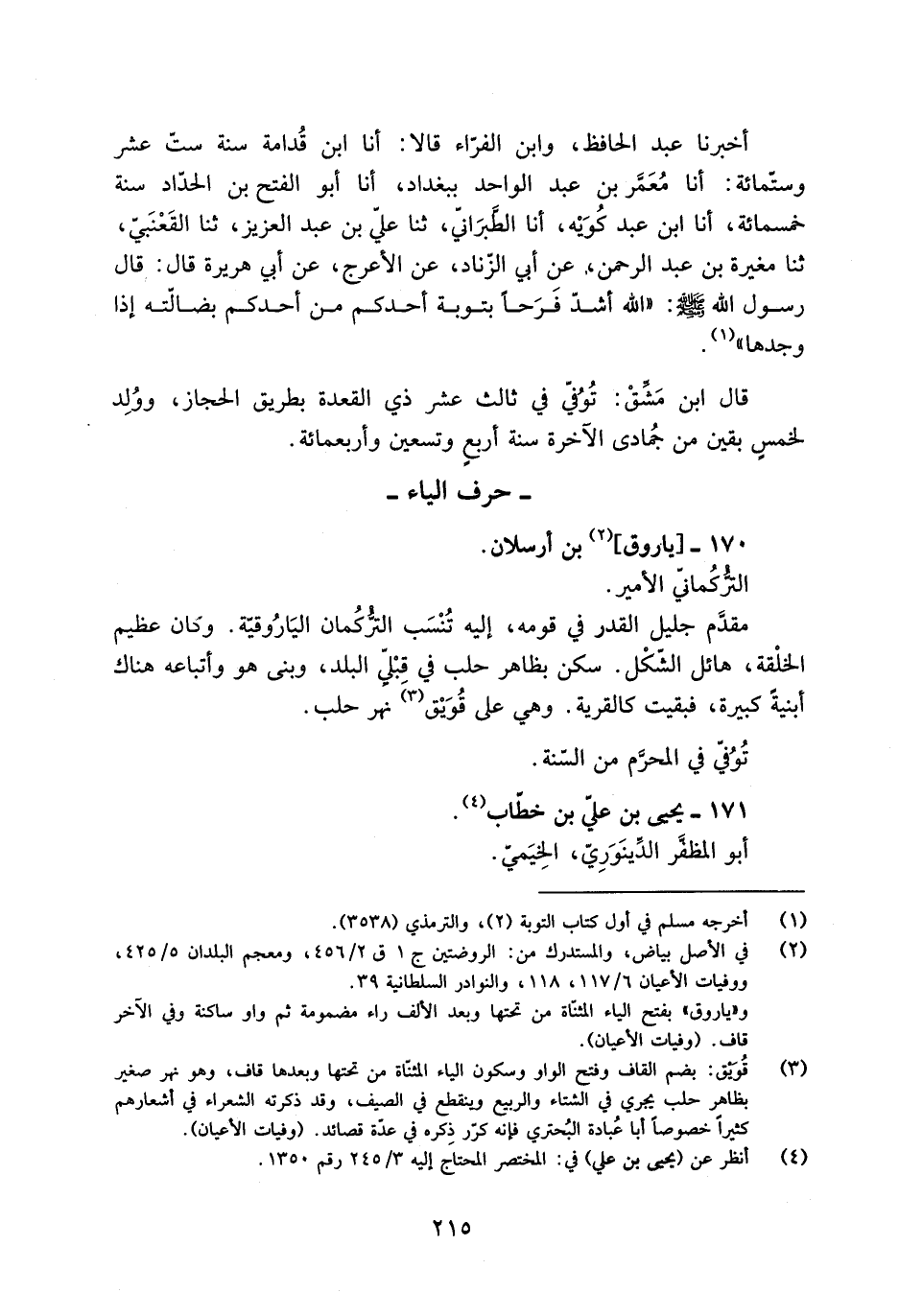 أَخْبَرَنَا عَبْدُ الْحَافِظِ، وَابْنُ الْفَرَّاءِ قَالَا: أنا ابْنُ قُدَامَةَ سَنَةَ سِتَّ عَشَرَ وَسِتِّمَائَةٍ: أنا مُعَمَّرُ بْنُ عَبْدِ الْوَاحِدِ بِبَغْدَادَ، أنا أَبُو الْفَتْحِ بْنِ الْحَدَّادِ سَنَةَ خَمْسِمَائَةٍ، أنا ابْنُ عَبْدِ كُوَيْهِ، أَنَا الطَّبَرَانِيُّ، ثنا عَلِيُّ بْنُ عَبْدِ الْعَزِيزِ، ثنا الْقَعْنَبِيُّ، ثنا مُغِيرَةُ بْنُ عَبْدِ الرَّحْمَنِ، عَنْ أَبِي الزِّنَادِ، عَنِ الْأَعْرَجِ، عَنْ أَبِي هُرَيْرَةَ قَالَ: قَالَ رَسُولُ اللَّهِ صَلَّى اللَّهُ عَلَيْهِ وَسَلَّمَ: «اللَّهُ أَشَدُّ فَرَحًا بِتَوْبَةِ أَحَدِكُمْ مِنْ أَحَدِكُمْ بِضَالَّتِهِ إِذَا وَجَدَهَا» [1] . قَالَ ابن مَشِّقْ: تُوُفّي فِي ثالث عشر ذي القعدة بطريق الحجاز، ووُلِد لخمسٍ بقين من جمادى الآخرة سنة أربع وتسعين وأربعمائة.