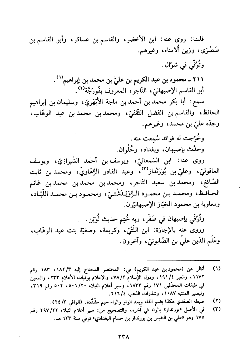 [3] في الأصل «بورندار» بالراء في آخره، والتصحيح من: سير أعلام النبلاء 22/ 297 رقم 175 وهو «علي بن النَّفيس بن بُورنداز بن حُسام البغدادي» توفي سنة 623 هـ.