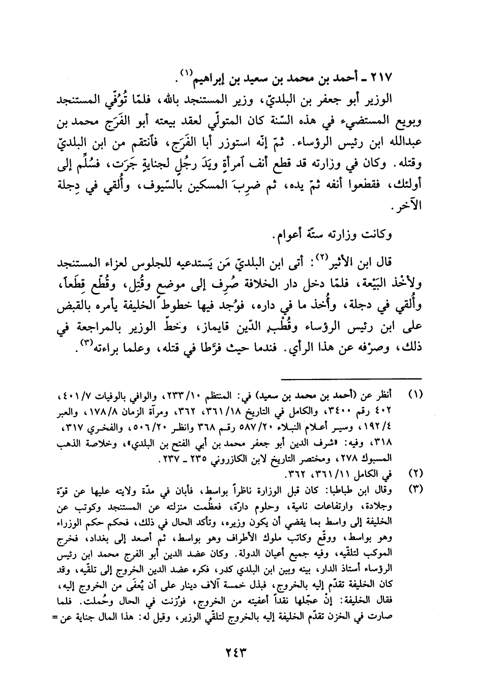 [1] انظر عن (أحمد بن محمد بن سعيد) في: المنتظم 10/ 233، والوافي بالوفيات 7/ 401، 402 رقم 3400، والكامل في التاريخ 18/ 361، 362، ومرآة الزمان 8/ 178، والعبر 4/ 192، وسير أعلام النبلاء 20/ 587 رقم 368 وانظر 20/ 506، والفخري 317، 318، وفيه: «شرف الدين أبو جعفر محمد بن أبي الفتح بن البلدي» ، وخلاصة الذهب المسبوك 278، ومختصر التاريخ لابن الكازروني 235- 237.