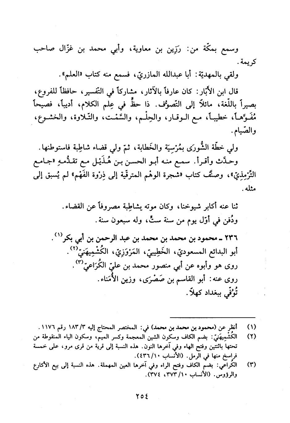 [2] الكشميهنيّ: بضم الكاف وسكون الشين المعجمة وكسر الميم، وسكون الياء المنقوطة من تحتها باثنتين وفتح الهاء وفي آخرها النون. هذه النسبة إلى قرية من قرى مرو، على خمسة فراسخ منها في الرمل. (الأنساب 10/ 436) .