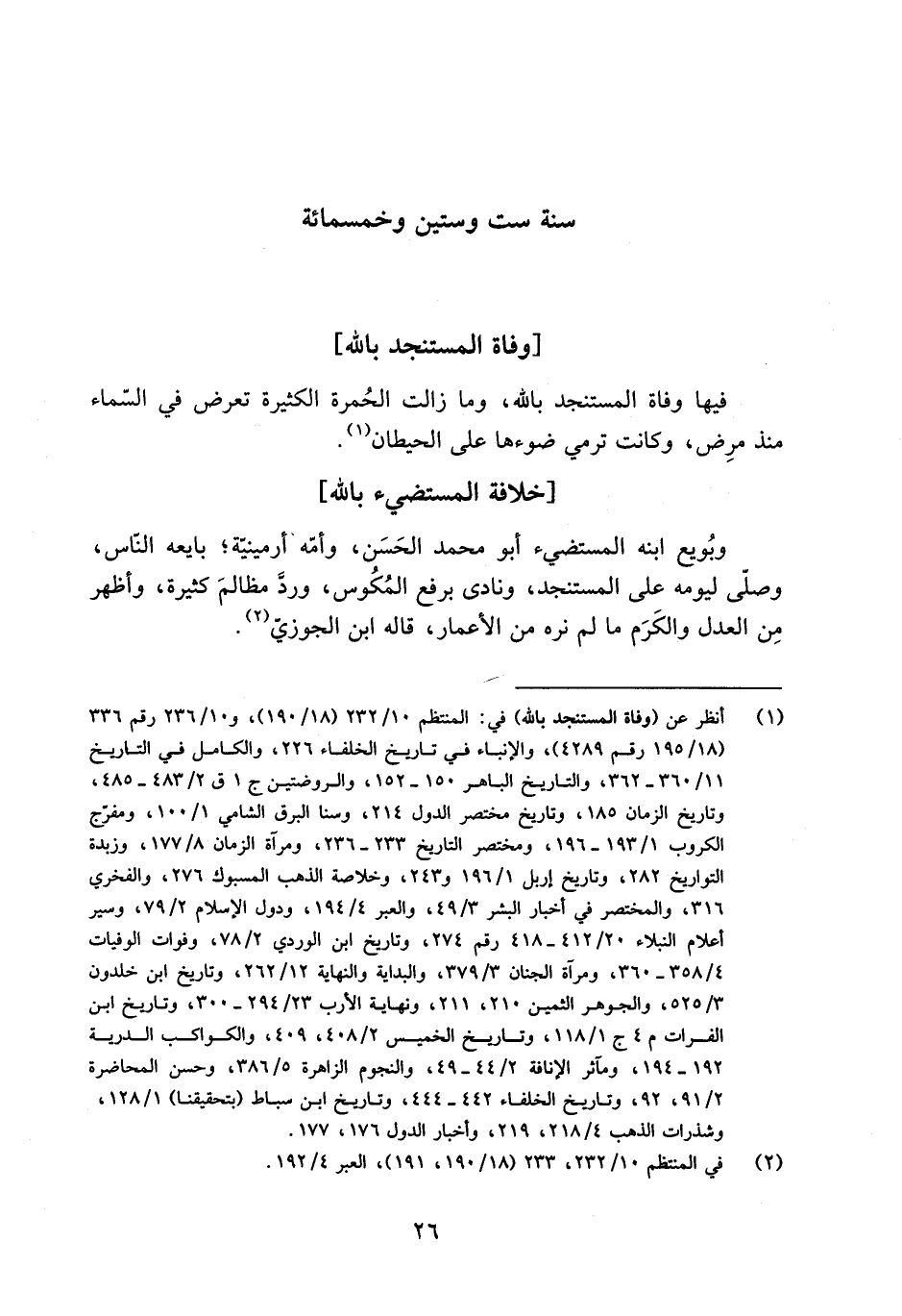 [1] انظر عن (وفاة المستنجد باللَّه) في: المنتظم 10/ 232 (18/ 190) ، و 10/ 236 رقم 336 (18/ 195 رقم 4289) ، والإنباء في تاريخ الخلفاء 226، والكامل في التاريخ 11/ 360- 362، والتاريخ الباهر 150- 152، والروضتين ج 1 ق 2/ 483- 485، وتاريخ الزمان 185، وتاريخ مختصر الدول 214، وسنا البرق الشامي 1/ 100، ومفرّج الكروب 1/ 193- 196، ومختصر التاريخ 233- 236، ومرآة الزمان 8/ 177، وزبدة التواريخ 282، وتاريخ إربل 1/ 196 و 243، وخلاصة الذهب المسبوك 276، والفخري 316، والمختصر في أخبار البشر 3/ 49، والعبر 4/ 194، ودول الإسلام 2/ 79، وسير أعلام النبلاء 20/ 412- 418 رقم 274، وتاريخ ابن الوردي 2/ 78، وفوات الوفيات 4/ 358- 360، ومرآة الجنان 3/ 379، والبداية والنهاية 12/ 262، وتاريخ ابن خلدون 3/ 525، والجوهر الثمين 210، 211، ونهاية الأرب 23/ 294- 300، وتاريخ ابن الفرات م 4 ج 1/ 118، وتاريخ الخميس 2/ 408، 409، والكواكب الدرية 192- 194، ومآثر الإنافة 2/ 44- 49، والنجوم الزاهرة 5/ 386، وحسن المحاضرة 2/ 91، 92، وتاريخ الخلفاء 442- 444، وتاريخ ابن سباط (بتحقيقنا) 1/ 128، وشذرات الذهب 4/ 218، 219، وأخبار الدول 176، 177.