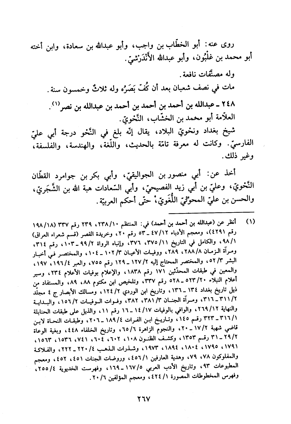 [1] انظر عن (عبد الله بن أحمد بن أحمد) في: المنتظم 10/ 238، 239 رقم 337 (18/ 198 رقم 4291) ، ومعجم الأدباء 12/ 47- 53 رقم 20، وخريدة القصر (قسم شعراء العراق) 1/ 98، والكامل في التاريخ 11/ 375، 376، وإنباه الرواة 2/ 99- 103، رقم 314، ومرآة الزمان 8/ 288، 289، ووفيات الأعيان 3/ 102- 104، والمختصر في أخبار البشر 3/ 52، والمختصر المحتاج إليه 2/ 127- 129 رقم 755، والعبر 4/ 196، 197، والمعين في طبقات المحدّثين 171 رقم 1838، والإعلام بوفيات الأعلام 234، وسير أعلام النبلاء 20/ 523- 528 رقم 337، وتلخيص ابن مكتوم 88، 89، والمستفاد من ذيل تاريخ بغداد 134- 136، وتاريخ ابن الوردي 2/ 124، ومسالك الأبصار ج 4 مجلّد 2/ 311- 316، ومرآة الجنان 3/ 381، 382، وفوات الوفيات 2/ 156، والبداية والنهاية 12/ 269، والوافي بالوفيات 17/ 14- 16 رقم 11، والذيل على طبقات الحنابلة 1/ 316- 323 رقم 145، وتاريخ ابن الفرات 4/ 189- 206، وطبقات النحاة لابن قاضي شهبة 2/ 17- 20، والنجوم الزاهرة 6/ 65، وتاريخ الخلفاء 448، وبغية الوعاة 2/ 29- 31 رقم 1353، وكشف الظنون 108، 602، 604، 741، 1536، 1563، 1791، 1795، 1804، 1894، 1973، وشذرات الذهب 4/ 220- 222، والفلاكة والمفلوكون 78، 79، وهدية العارفين 1/ 456، وروضات الجنات 451، 452، ومعجم المطبوعات 93، وتاريخ الأدب العربيّ 5/ 167- 169، وفهرست الخديوية 4/ 255، وفهرس المخطوطات المصورة 1/ 424، ومعجم المؤلفين 6/ 20.