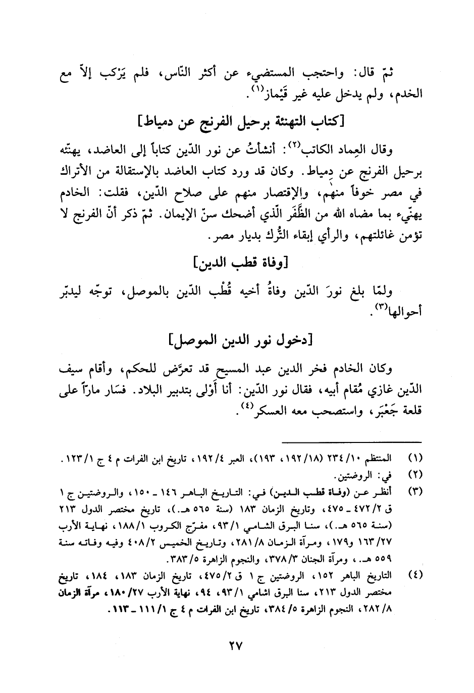 [4] التاريخ الباهر 152، الروضتين ج 1 ق 2/ 475، تاريخ الزمان 183، 184، تاريخ مختصر الدول 213، سنا البرق اشامي 1/ 93، 94، نهاية الأرب 27/ 180، مرآة الزمان 8/ 282، النجوم الزاهرة 5/ 384، تاريخ ابن الفرات م 4 ج 1/ 111- 113.