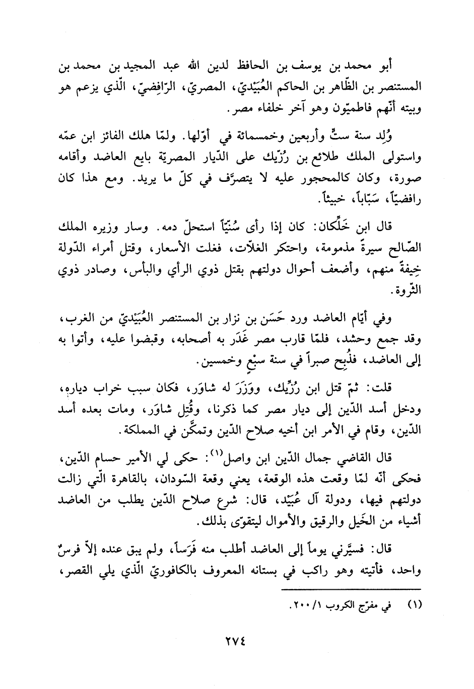 قَالَ: فسيَّرني يوما إلى العاضد أطلب منه فَرَسًا، ولم يبق عنده إلّا فرسٌ واحد، فأتيته وهو راكب فِي بستانه المعروف بالكافوريّ الَّذِي يلي القصر،