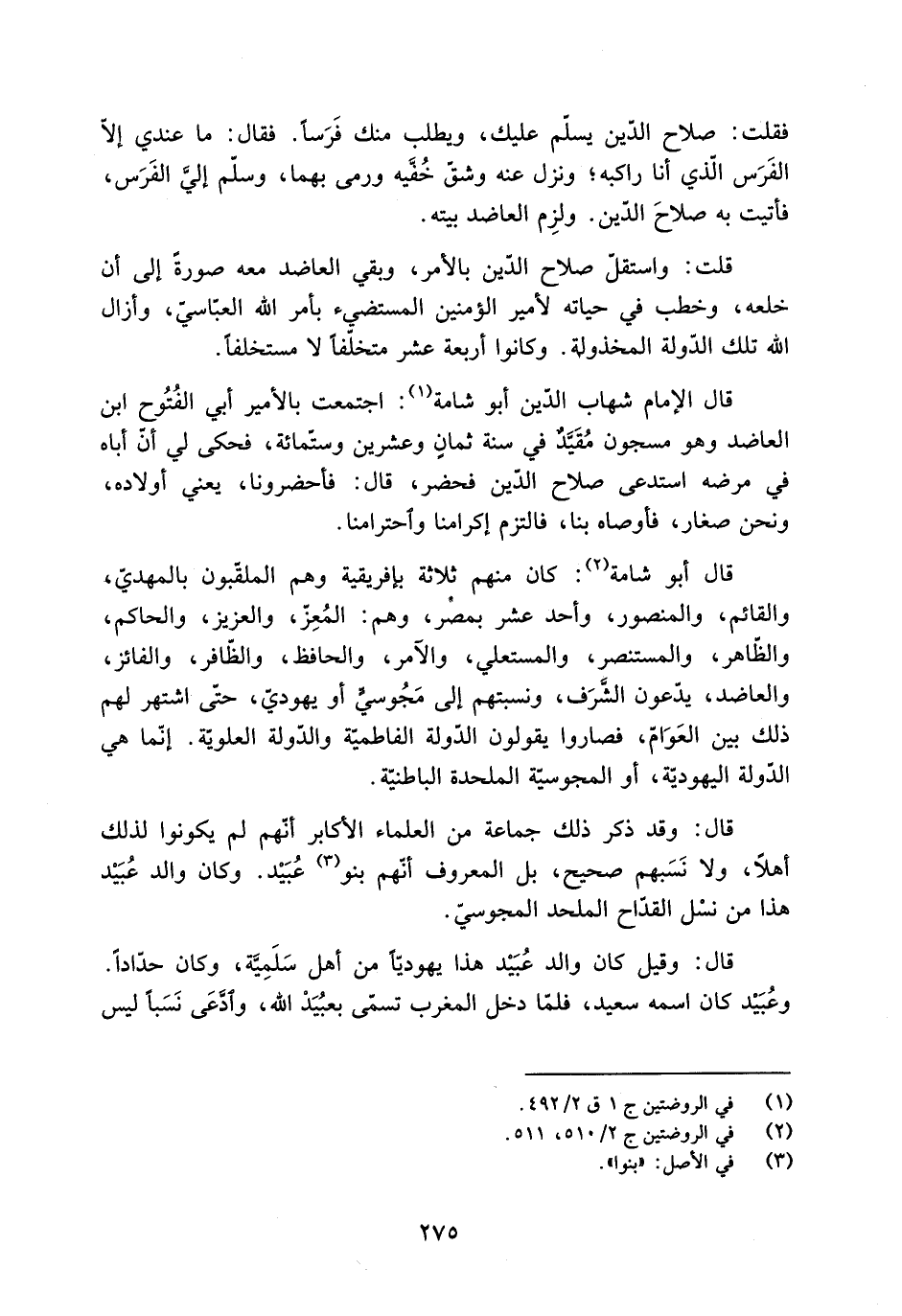قَالَ: وقد ذكر ذَلِكَ جماعة من العلماء الأكابر أنّهم لم يكونوا لذلك أهلا، ولا نَسَبهم صحيح، بل المعروف أنّهم بنو [3] عُبَيْد. وكان والد عُبَيْد هذا من نسْل القدّاح الملحد المجوسيّ.