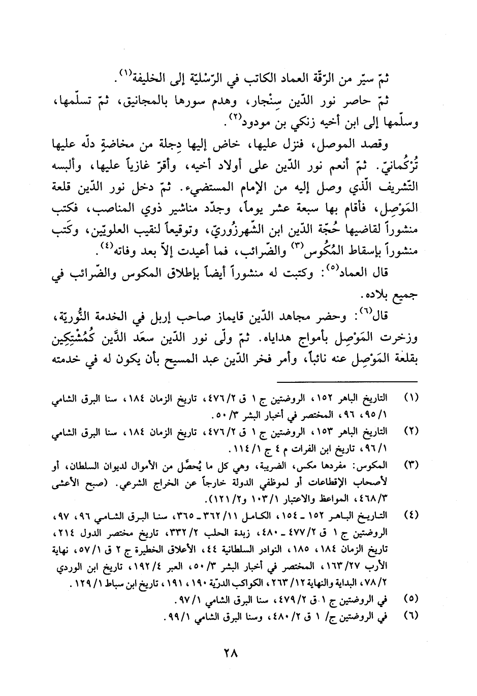 [2] التاريخ الباهر 153، الروضتين ج 1 ق 2/ 476، تاريخ الزمان 184، سنا البرق الشامي 1/ 96، تاريخ ابن الفرات م 4 ج 1/ 114.
