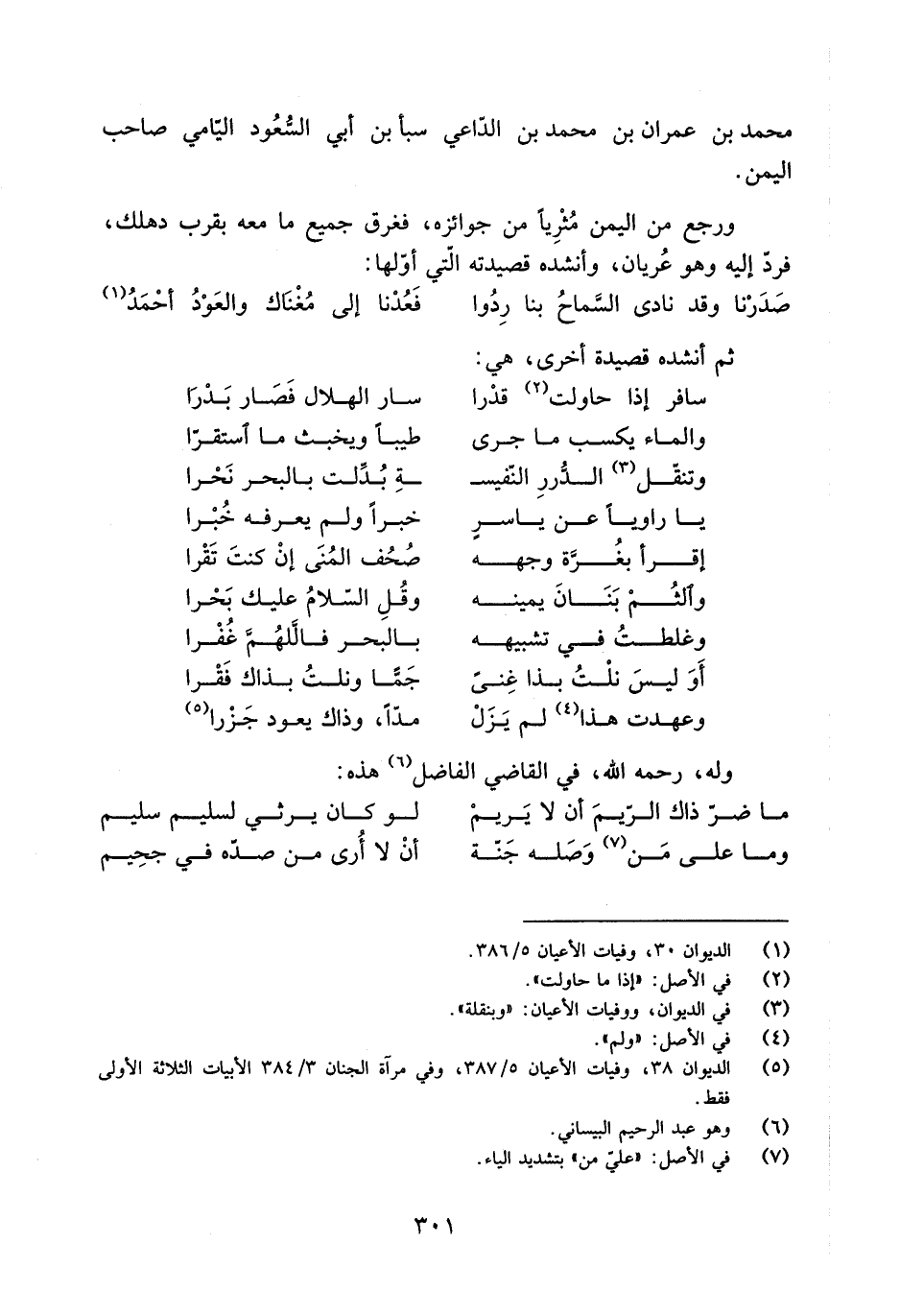 [5] الديوان 38، وفيات الأعيان 5/ 387، وفي مرآة الجنان 3/ 384 الأبيات الثلاثة الأولى فقط.