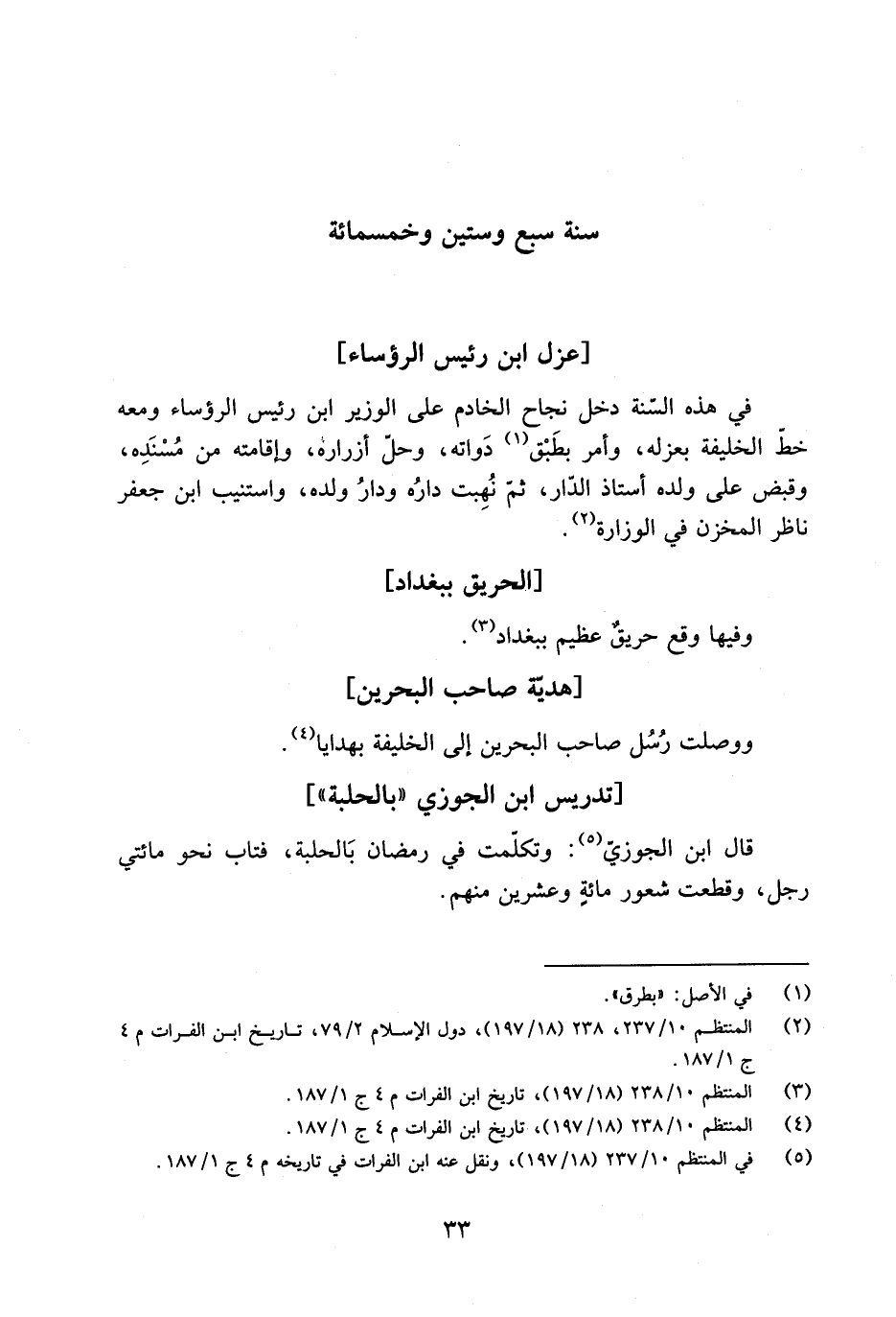[5] في المنتظم 10/ 237 (18/ 197) ، ونقل عنه ابن الفرات في تاريخه م 4 ج 1/ 187.
