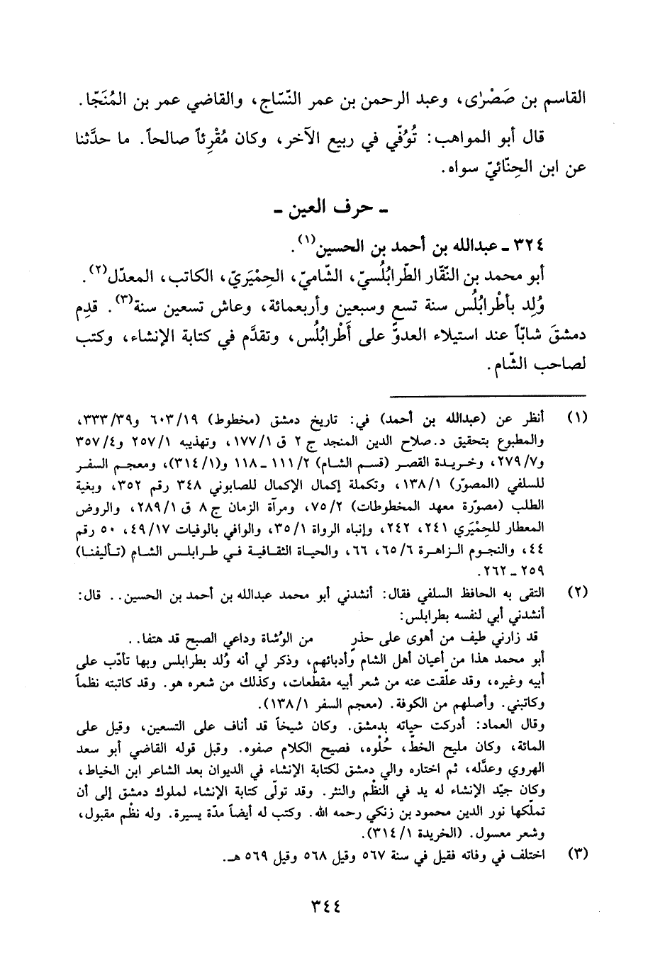 [1] انظر عن (عبد الله بن أحمد) في: تاريخ دمشق (مخطوط) 19/ 603 و 39/ 333، والمطبوع بتحقيق د. صلاح الدين المنجد ج 2 ق 1/ 177، وتهذيبه 1/ 257 و 4/ 357 و 7/ 279، وخريدة القصر (قسم الشام) 2/ 111- 118 و (1/ 314) ، ومعجم السفر للسلفي (المصوّر) 1/ 138، وتكملة إكمال الإكمال للصابوني 348 رقم 352، وبغية الطلب (مصوّرة معهد المخطوطات) 2/ 75، ومرآة الزمان ج 8 ق 1/ 289، والروض المعطار للحميري 241، 242، وإنباه الرواة 1/ 35، والوافي بالوفيات 17/ 49، 50 رقم 44، والنجوم الزاهرة 6/ 65، 66، والحياة الثقافية في طرابلس الشام (تأليفنا) 259- 262.
