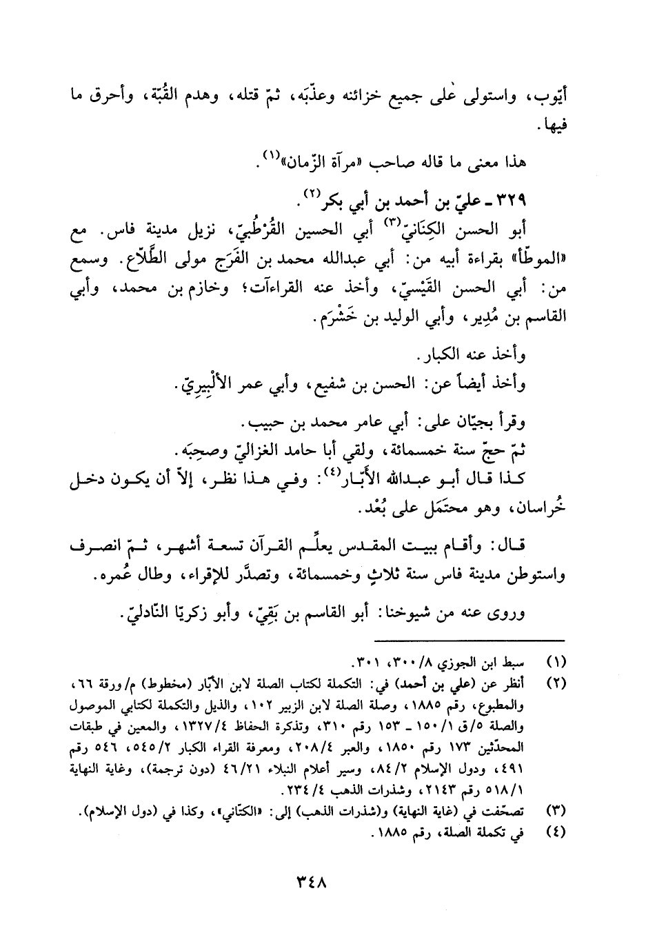 [2] انظر عن (علي بن أحمد) في: التكملة لكتاب الصلة لابن الأبّار (مخطوط) م/ ورقة 66، والمطبوع، رقم 1885، وصلة الصلة لابن الزبير 102، والذيل والتكملة لكتابي الموصول والصلة 5/ ق 1/ 150- 153 رقم 310، وتذكرة الحفاظ 4/ 1327، والمعين في طبقات المحدّثين 173 رقم 1850، والعبر 4/ 208، ومعرفة القراء الكبار 2/ 545، 546 رقم 491، ودول الإسلام 2/ 84، وسير أعلام النبلاء 21/ 46 (دون ترجمة) ، وغاية النهاية 1/ 518 رقم 2143، وشذرات الذهب 4/ 234.