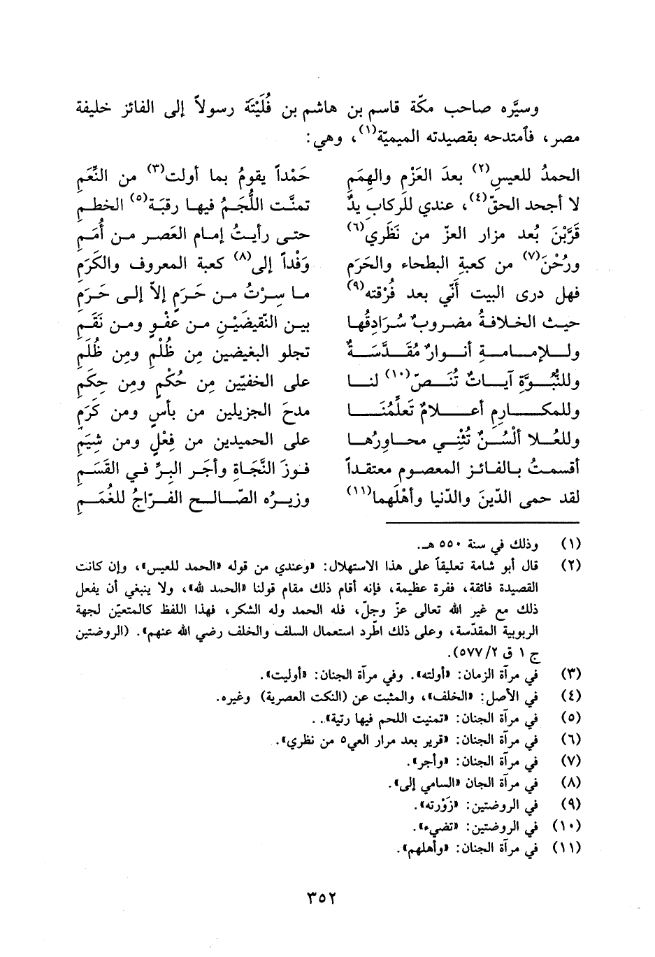 [2] قال أبو شامة تعليقا على هذا الاستهلال: «وعندي من قوله «الحمد للعيس» ، وإن كانت القصيدة فائقة، فقرة عظيمة، فإنه أقام ذلك مقام قولنا «الحمد للَّه» ، ولا ينبغي أن يفعل ذلك مع غير الله تعالى عزّ وجلّ، فله الحمد وله الشكر، فهذا اللفظ كالمتعيّن لجهة الربوبية المقدّسة، وعلى ذلك اطّرد استعمال السلف والخلف رضي الله عنهم» . (الروضتين ج 1 ق 2/ 577) .