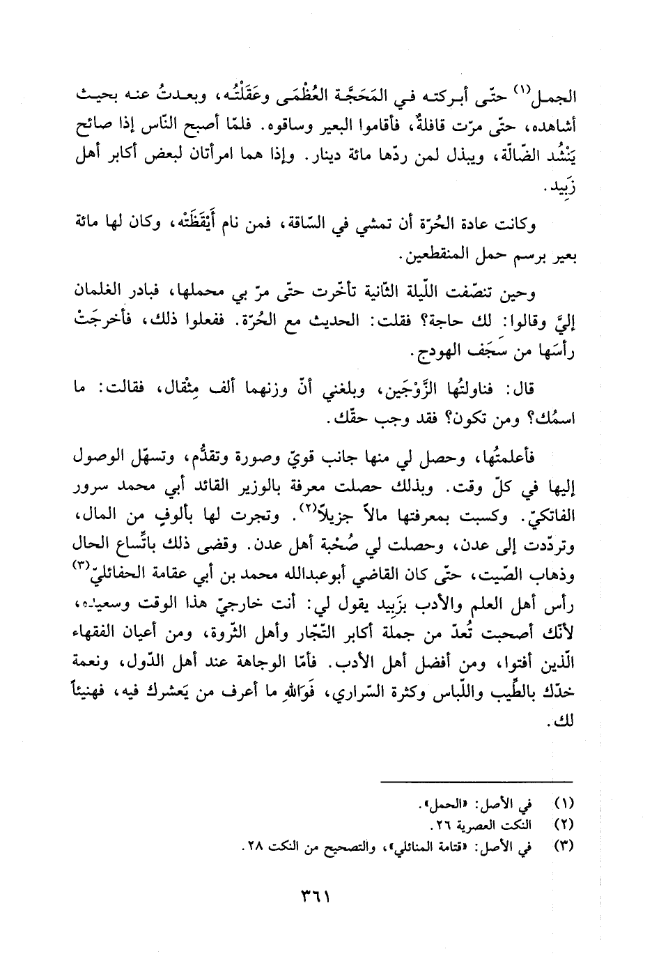 الجمل [1] حَتَّى أبركته فِي المَحَجَّة العُظْمَى وعَقَلْتُه، وبعدتُ عَنْهُ بحيث أشاهده، حَتَّى مرّت قافلةٌ، فأقاموا البعير وساقوه. فلمّا أصبح النَّاس إذا صائح يَنْشُد الضّالَّة، ويبذل لمن ردّها مائة دينار. وإذا هما امرأتان لبعض أكابر أهل زَبِيد.