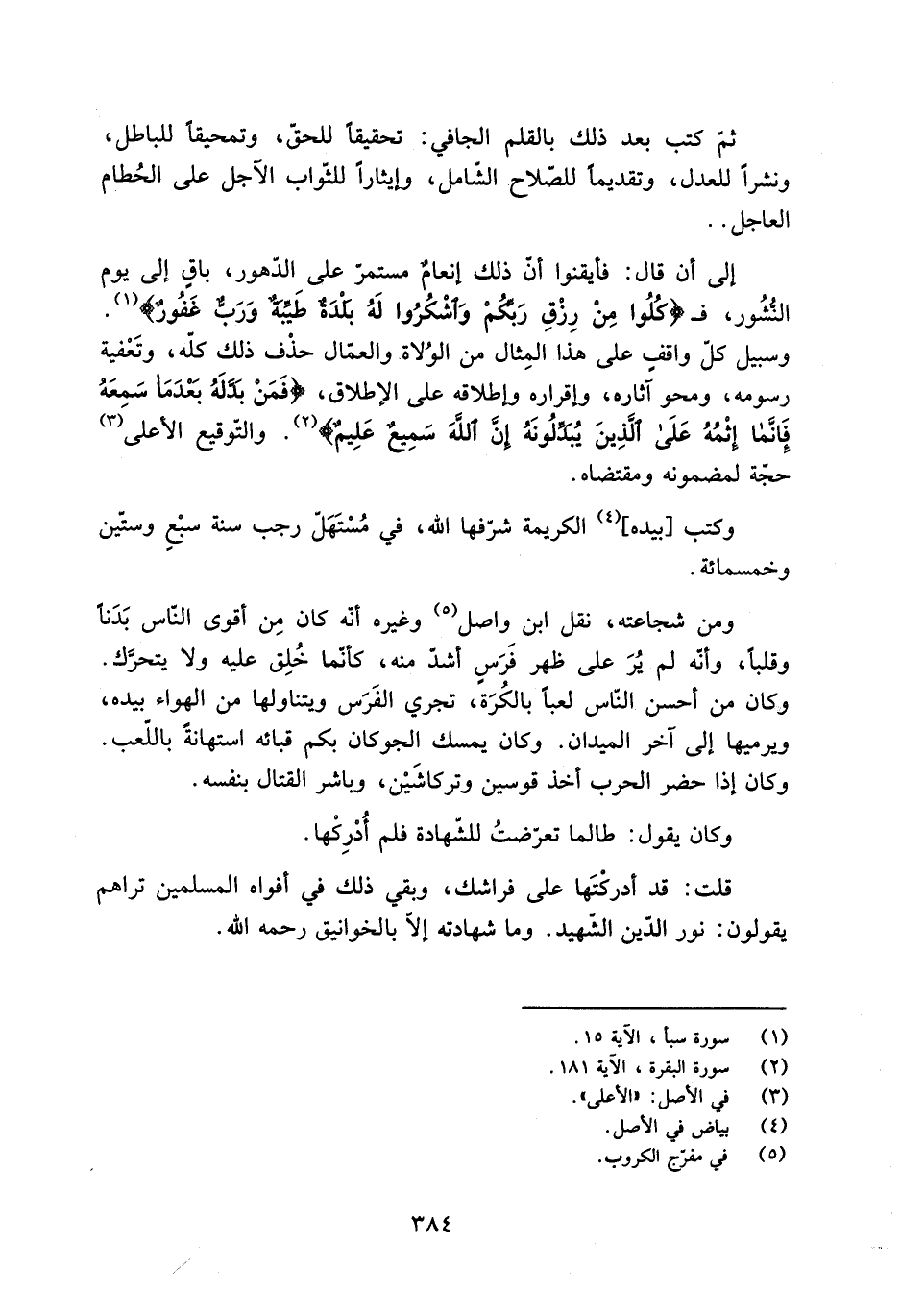 ثُمَّ كتب بعد ذَلِكَ بالقلم الجافي: تحقيقا للحقّ، وتمحيقا للباطل، ونشرا للعدل، وتقديما للصّلاح الشّامل، وإيثارا للثّواب الآجل عَلَى الحُطام العاجل..