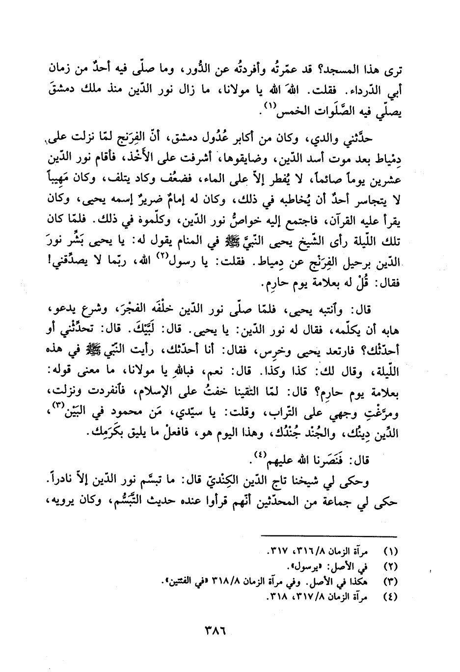 قَالَ: وانتبه يحيى، فلمّا صلّى نور الدِّين خلْفَه الفجْرَ، وشرع يدعو، هابه أن يكلّمه، فقال لَهُ نور الدِّين: يا يحيى. قَالَ: لَبَّيْكَ. قَالَ: تحدِّثْني أو أحدّثْك؟ فارتعد يحيى وخرِس، فقال: أَنَا أحدّثك، رَأَيْتُ النَّبِيَّ صَلَّى اللَّهُ عَلَيْهِ وَسَلَّمَ فِي هذه اللّيلة، وقال لك: كذا وكذا. قَالَ: نعم، فباللَّه يا مولانا، ما معنى قوله: