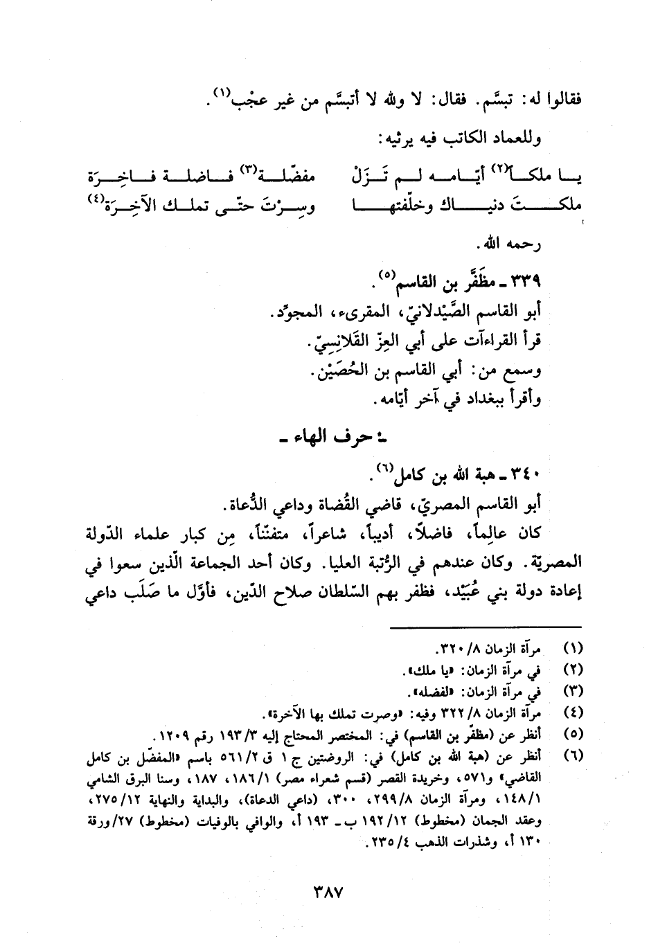 [6] انظر عن (هبة الله بن كامل) في: الروضتين ج 1 ق 2/ 561 باسم «المفضّل بن كامل القاضي» و 571، وخريدة القصر (قسم شعراء مصر) 1/ 186، 187، وسنا البرق الشامي 1/ 148، ومرآة الزمان 8/ 299، 300، (داعي الدعاة) ، والبداية والنهاية 12/ 275، وعقد الجمان (مخطوط) 12/ 192 ب- 193 أ، والوافي بالوفيات (مخطوط) 27/ ورقة 130 أ، وشذرات الذهب 4/ 235.