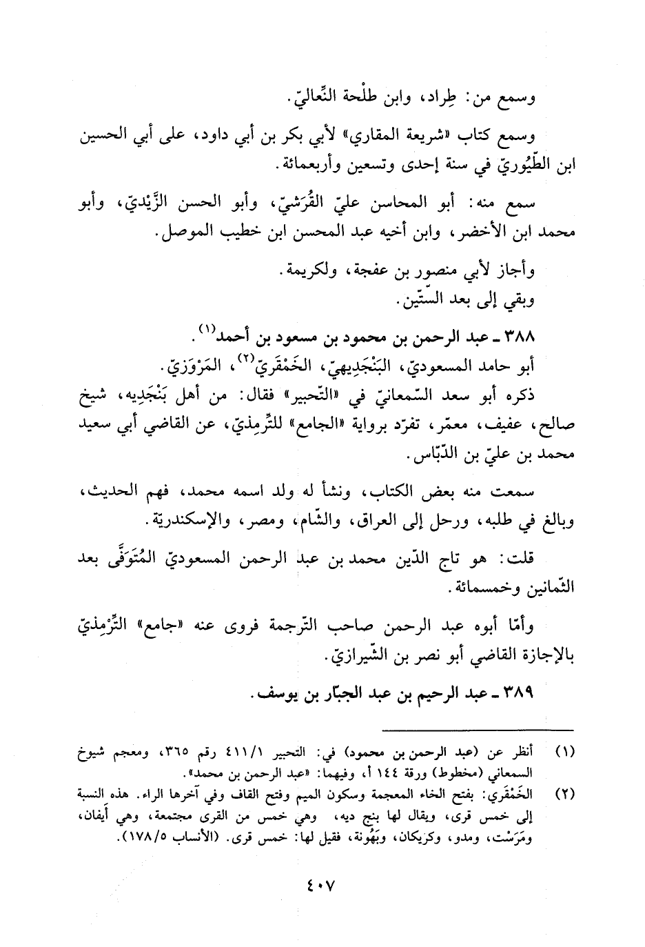 [1] انظر عن (عبد الرحمن بن محمود) في: التحبير 1/ 411 رقم 365، ومعجم شيوخ السمعاني (مخطوط) ورقة 144 أ، وفيهما: «عبد الرحمن بن محمد» .