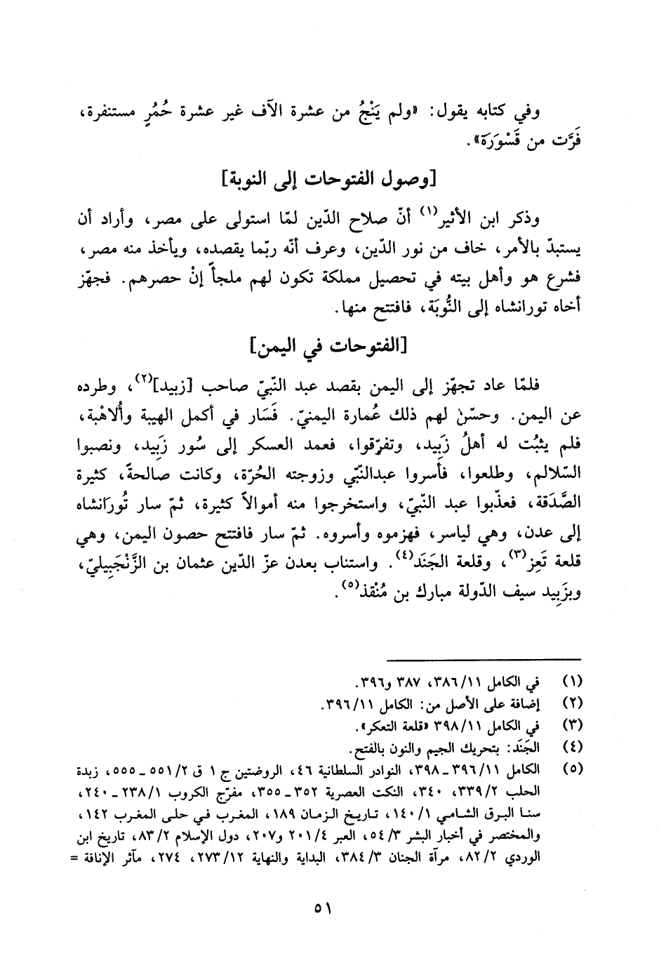 وذكر ابن الأثير [1] أنّ صلاح الدّين لمّا استولى عَلَى مصر، وأراد أن يستبدّ بالأمر، خاف من نور الدّين، وعرف أَنَّهُ ربّما يقصده، ويأخذ منه مصر، فشرع هُوَ وأهل بيته فِي تحصيل مملكة تكون لهم ملجأ إنْ حصرهم. فجهّز أخاه توران شاه إلى النُّوبَة، فافتتح منها.