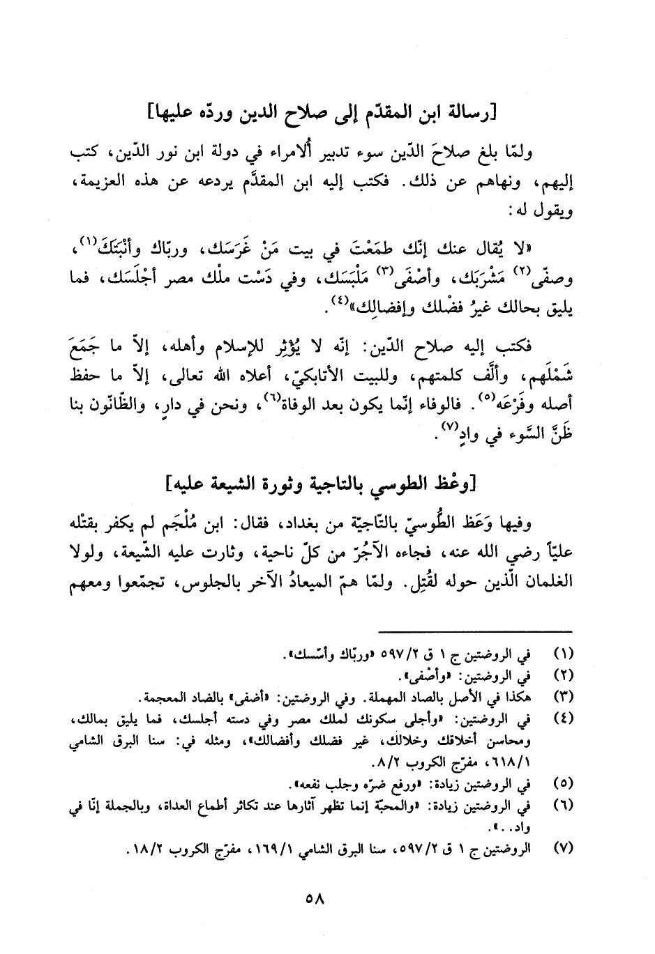 [7] الروضتين ج 1 ق 2/ 597، سنا البرق الشامي 1/ 169، مفرّج الكروب 2/ 18.