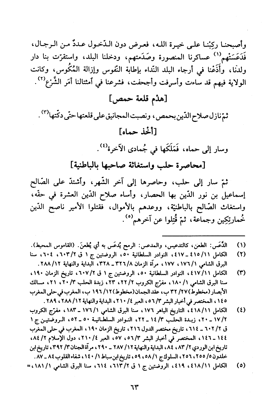[3] الكامل 11/ 417، النوادر السلطانية 50، الروضتين ج 1 ق 2/ 607، تاريخ الزمان 190، سنا البرق الشامي 1/ 180، مفرّج الكروب 2/ 22، 23، زبدة الحلب 3/ 20، 21، مسالك الأبصار (مخطوط) 27/ 32 ب، عقد الجمان (مخطوط) 12/ 196 ب، المغرب في حلى المغرب 145، المختصر في أخبار البشر 3/ 56، العبر 4/ 210، البداية والنهاية 12/ 288، 289.