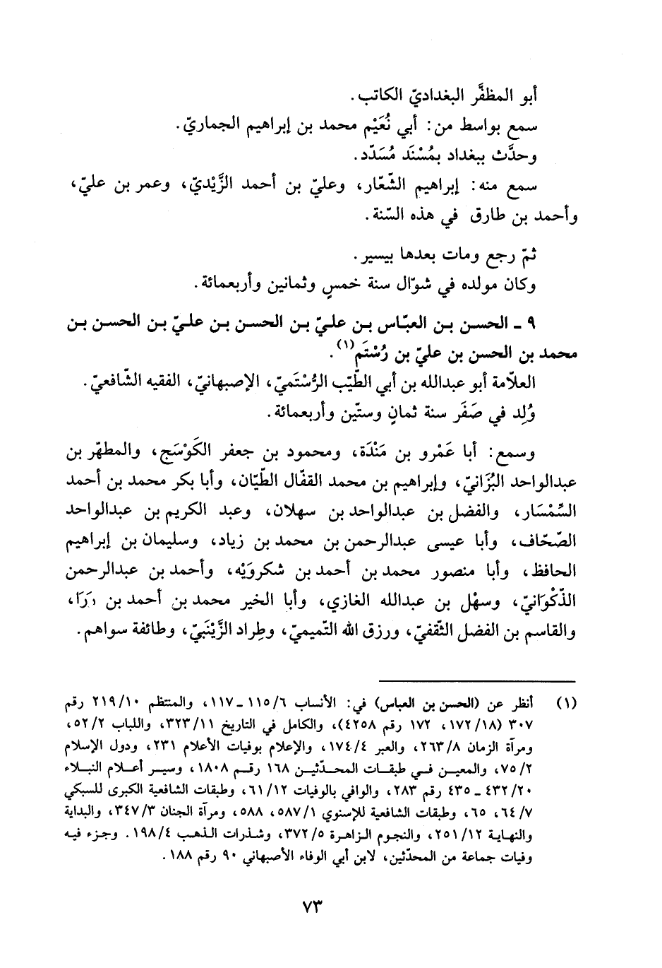 [1] انظر عن (الحسن بن العباس) في: الأنساب 6/ 115- 117، والمنتظم 10/ 219 رقم 307 (18/ 172، 172 رقم 4258) ، والكامل في التاريخ 11/ 323، واللباب 2/ 52، ومرآة الزمان 8/ 263، والعبر 4/ 174، والإعلام بوفيات الأعلام 231، ودول الإسلام 2/ 75، والمعين في طبقات المحدّثين 168 رقم 1808، وسير أعلام النبلاء 20/ 432- 435 رقم 283، والوافي بالوفيات 12/ 61، وطبقات الشافعية الكبرى للسبكي 7/ 64، 65، وطبقات الشافعية للإسنويّ 1/ 587، 588، ومرآة الجنان 3/ 347، والبداية والنهاية 12/ 251، والنجوم الزاهرة 5/ 372، وشذرات الذهب 4/ 198. وجزء فيه وفيات جماعة من المحدّثين، لابن أبي الوفاء الأصبهاني 90 رقم 188.