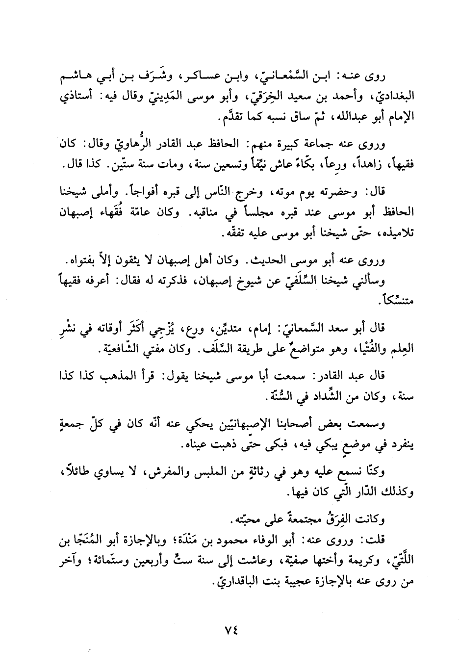 قَالَ: وحضرته يوم موته، وخرج النّاس إلى قبره أفواجا. وأملى شيخنا الحافظ أَبُو مُوسَى عند قبره مجلسا فِي مناقبه. وكان عامَّة فُقَهاء أصبهان تلاميذه، حتّى شيخنا أَبُو مُوسَى عَلَيْهِ تفقّه.