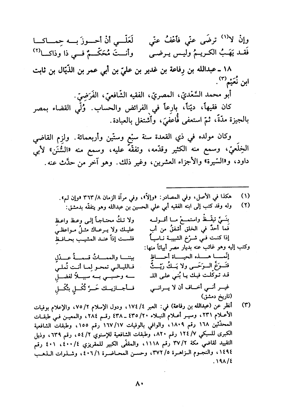 [3] انظر عن (عبد الله بن رفاعة) في: العبر 4/ 174، ودول الإسلام 2/ 75، والإعلام بوفيات الأعلام 231، وسير أعلام النبلاء 20/ 435- 438 رقم 284، والمعين في طبقات المحدّثين 168 رقم 1809، والوافي بالوفيات 17/ 167 رقم 155، وطبقات الشافعية الكبرى للسبكي 7/ 124 رقم 820، وطبقات الشافعية للإسنويّ 2/ 54، رقم 639، وذيل التقييد لقاضي مكة 2/ 37 رقم 1118، والمقفّى الكبير للمقريزي 4/ 400، 401 رقم 1494، والنجوم الزاهرة 5/ 372، وحسن المحاضرة 1/ 406، وشذرات الذهب 4/ 198.