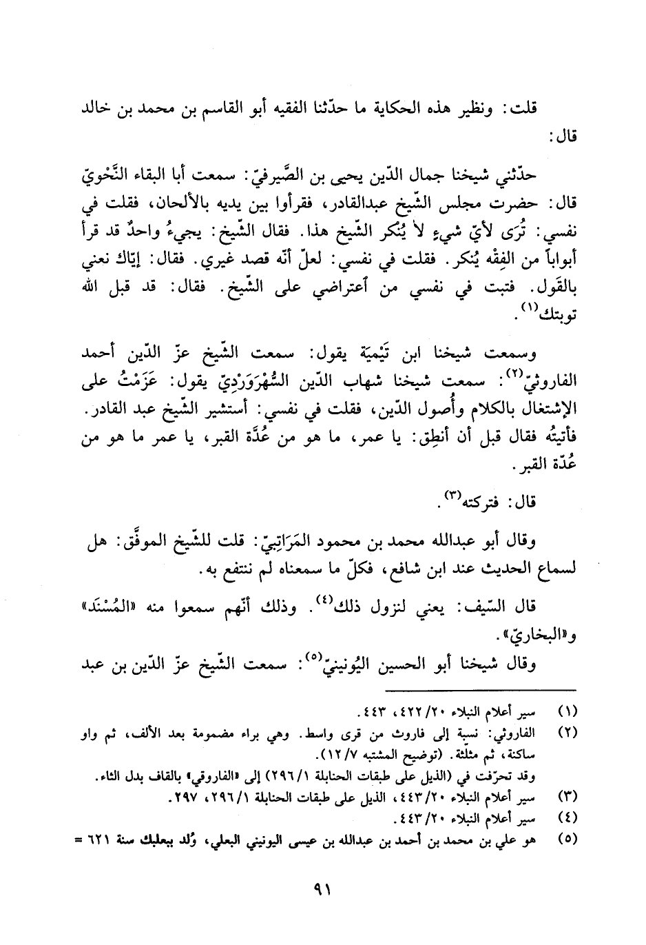 وسمعت شيخنا ابن تَيْميَة يَقُولُ: سَمِعْتُ الشَّيْخ عزّ الدّين أحمد الفاروثيّ [2] : سَمِعْتُ شيخنا شهاب الدّين السُّهْرَوَرْدِيّ يَقُولُ: عَزَمْتُ عَلَى الاشتغال بالكلام وأُصول الدّين، فقلت في نفسي: أستشير الشَّيْخ عَبْد القادر.