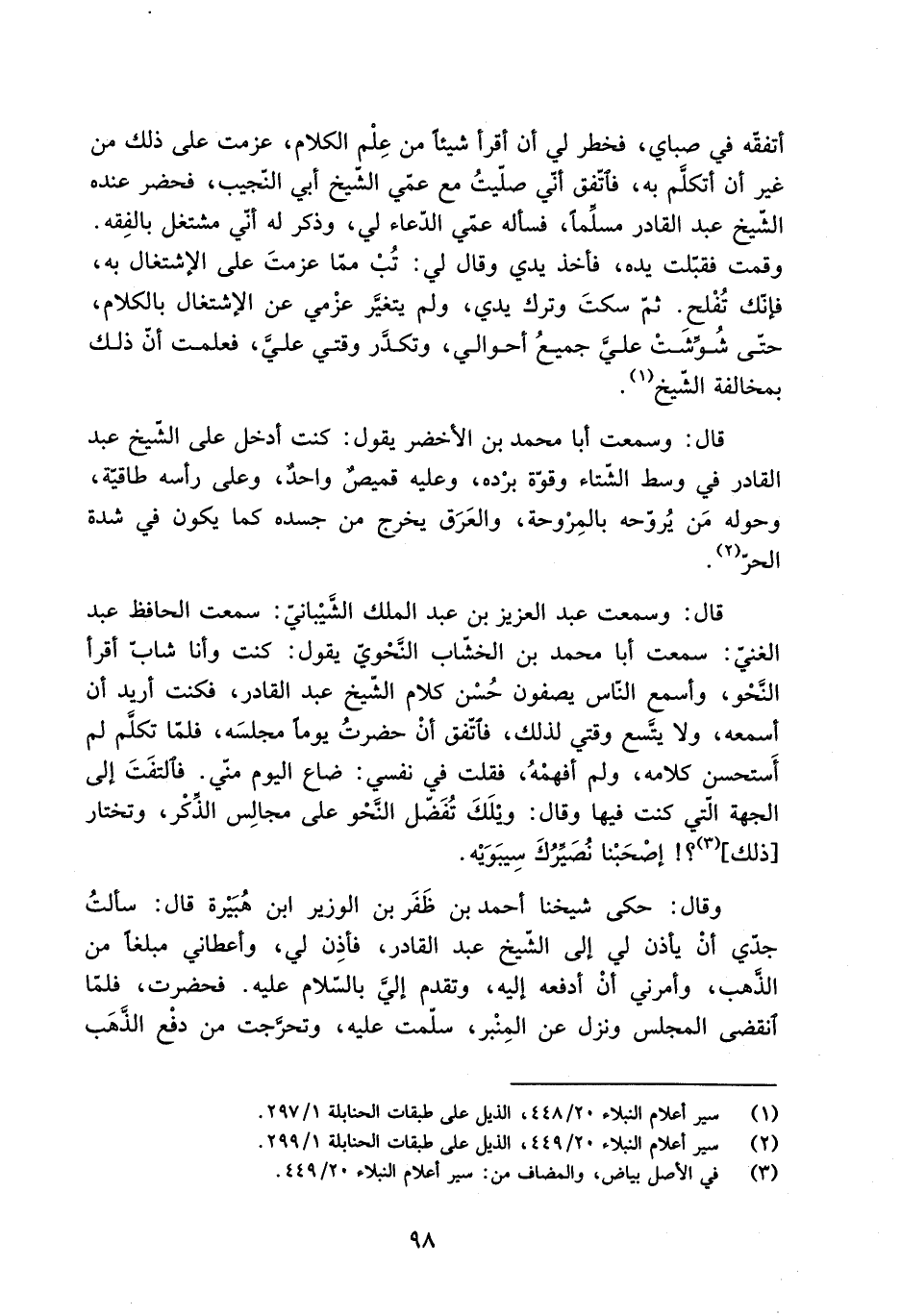 قَالَ: وسمعت عَبْد العزيز بْن عَبْد الملك الشَّيْبانيّ: سَمِعْتُ الحافظ عَبْد الغنيّ: سَمِعْتُ أَبَا مُحَمَّد بْن الخشّاب النَّحْويّ يَقُولُ: كنت وأنا شابّ أقرأ النَّحْو، وأسمع النّاس يصفون حُسْن كلام الشَّيْخ عَبْد القادر، فكنت أريد أن أسمعه، ولا يتَّسع وقتي لذلك، فاتّفق أنْ حضرتُ يوما مجلسَه، فلمّا تكلَّم لم أَستحسن كلامه، ولم أفهمْهُ، فقلت فِي نفسي: ضاع اليوم منّي. فالتفَتَ إلى الجهة الّتي كنت فيها وقال: وَيْلَكَ تُفَضّل النَّحْو عَلَى مجالِس الذِّكْر، وتختار [ذَلِكَ] [3] ؟! اصْحَبْنا نُصَيِّرُكَ سِيبَوَيْه.