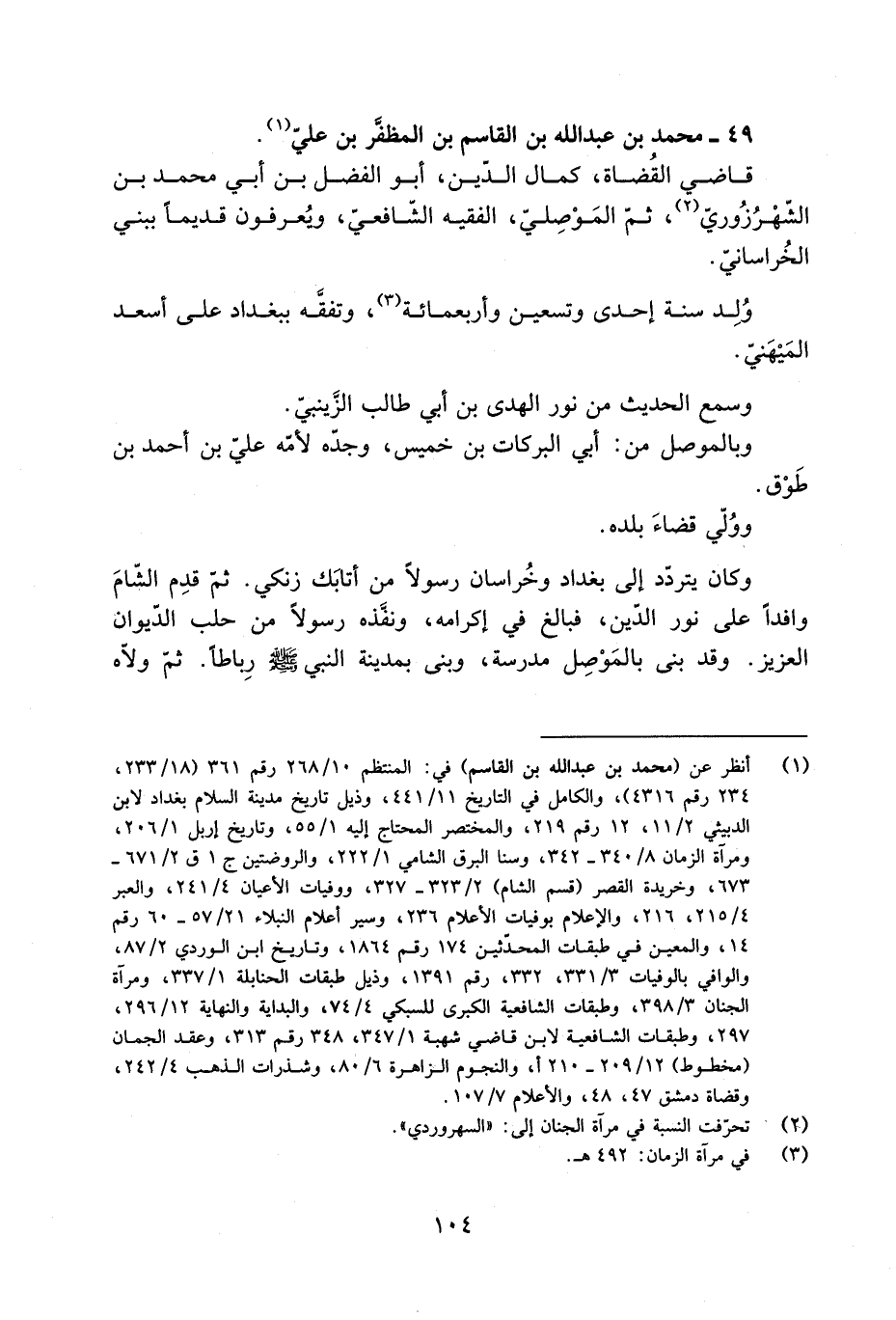 [1] انظر عن (محمد بن عبد الله بن القاسم) في: المنتظم 10/ 268 رقم 361 (18/ 233، 234 رقم 4316) ، والكامل في التاريخ 11/ 441، وذيل تاريخ مدينة السلام بغداد لابن الدبيثي 2/ 11، 12 رقم 219، والمختصر المحتاج إليه 1/ 55، وتاريخ إربل 1/ 206، ومرآة الزمان 8/ 340- 342، وسنا البرق الشامي 1/ 222، والروضتين ج 1 ق 2/ 671- 673، وخريدة القصر (قسم الشام) 2/ 323- 327، ووفيات الأعيان 4/ 241، والعبر 4/ 215، 216، والإعلام بوفيات الأعلام 236، وسير أعلام النبلاء 21/ 57- 60 رقم 14، والمعين في طبقات المحدّثين 174 رقم 1864، وتاريخ ابن الوردي 2/ 87، والوافي بالوفيات 3/ 331، 332، رقم 1391، وذيل طبقات الحنابلة 1/ 337، ومرآة الجنان 3/ 398، وطبقات الشافعية الكبرى للسبكي 4/ 74، والبداية والنهاية 12/ 296، 297، وطبقات الشافعية لابن قاضي شهبة 1/ 347، 348 رقم 313، وعقد الجمان (مخطوط) 12/ 209- 210 أ، والنجوم الزاهرة 6/ 80، وشذرات الذهب 4/ 242، وقضاة دمشق 47، 48، والأعلام 7/ 107.