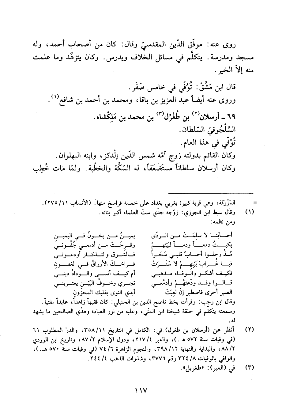 [2] انظر عن (أرسلان بن طغرل) في: الكامل في التاريخ 11/ 358، والدرّ المطلوب 61 (في وفيات سنة 572 هـ.) ، والعبر 4/ 217، ودول الإسلام 2/ 87، وتاريخ ابن الوردي 2/ 88، والبداية والنهاية 12/ 398، والنجوم الزاهرة 6/ 74 (في وفيات سنة 570 هـ.) ، والوافي بالوفيات 8/ 324 رقم 3776، وشذرات الذهب 4/ 244.