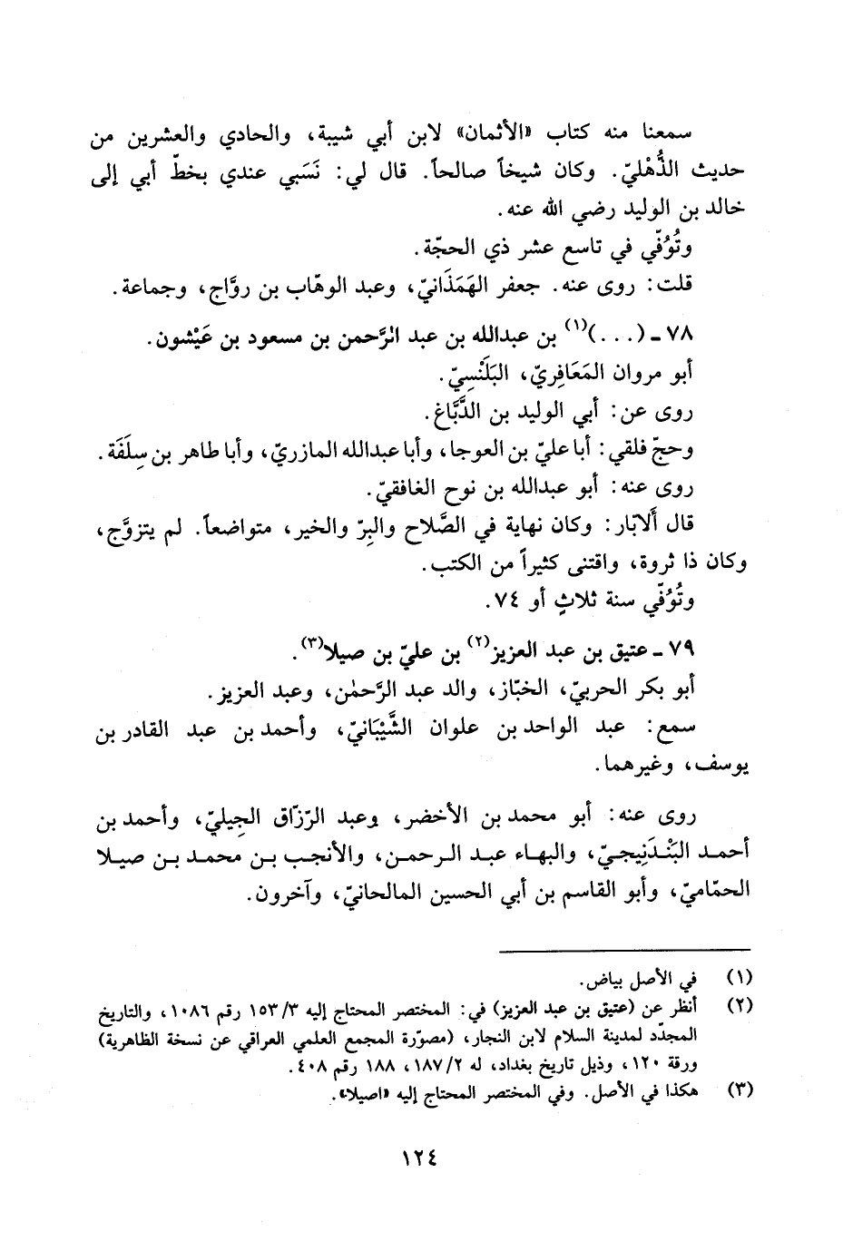 [2] انظر عن (عتيق بن عبد العزيز) في: المختصر المحتاج إليه 3/ 153 رقم 1086، والتاريخ المجدّد لمدينة السلام لابن النجار، (مصوّرة المجمع العلمي العراقي عن نسخة الظاهرية) ورقة 120، وذيل تاريخ بغداد، له 2/ 187، 188 رقم 408.