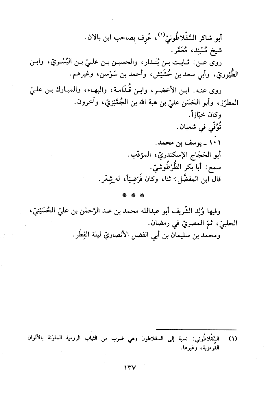 [1] السّقلاطوني: نسبة إلى السقلاطون وهي ضرب من الثياب الروميّة الملوّنة بالألوان القرمزية، وغيرها.