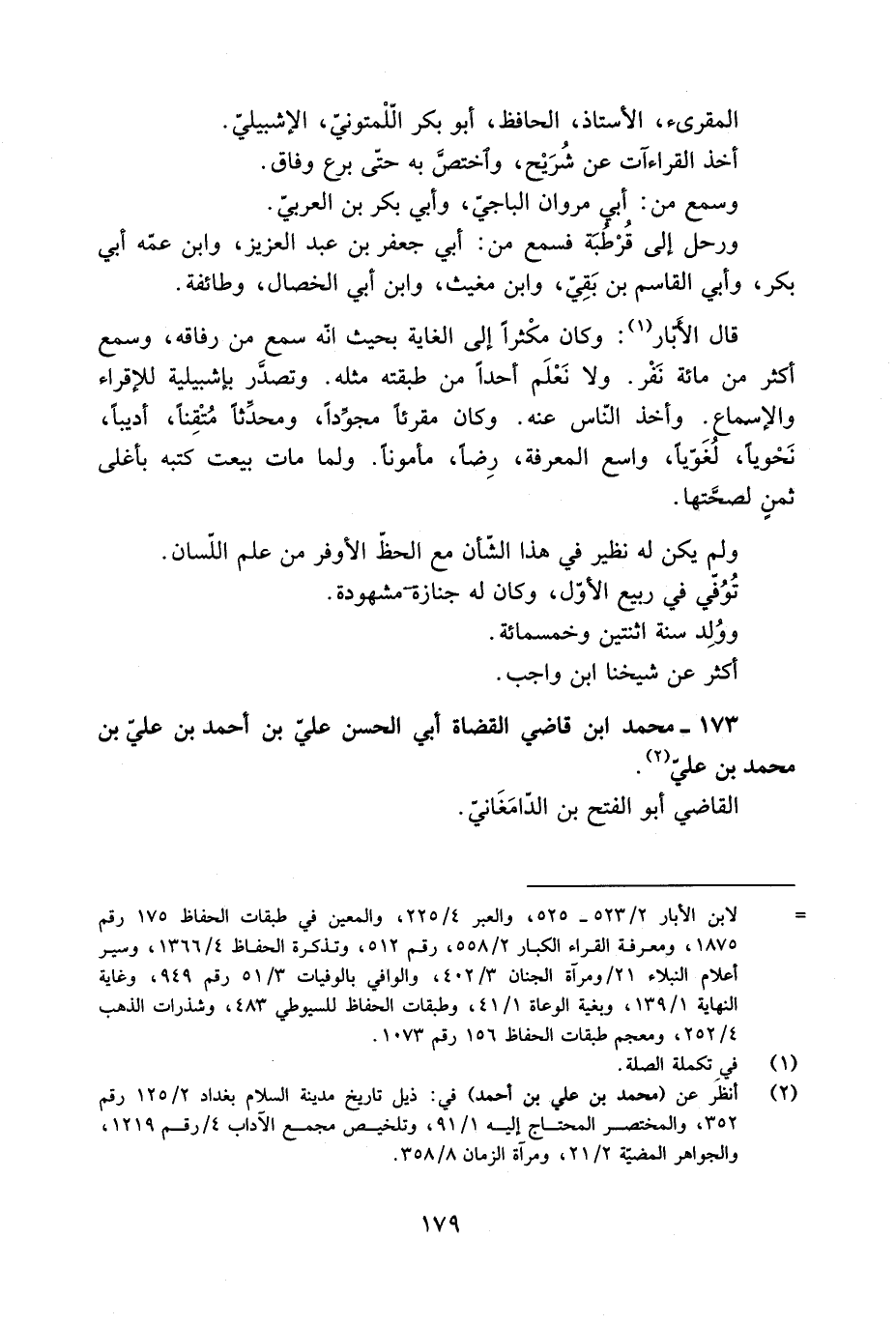 [ (-) ] لابن الأبّار 2/ 523- 525، والعبر 4/ 225، والمعين في طبقات الحفاظ 175 رقم 1875، ومعرفة القراء الكبار 2/ 558، رقم 512، وتذكرة الحفاظ 4/ 1366، وسير أعلام النبلاء 21/ ومرآة الجنان 3/ 402، والوافي بالوفيات 3/ 51 رقم 949، وغاية النهاية 1/ 139، وبغية الوعاة 1/ 41، وطبقات الحفاظ للسيوطي 483، وشذرات الذهب 4/ 252، ومعجم طبقات الحفاظ 156 رقم 1073.
