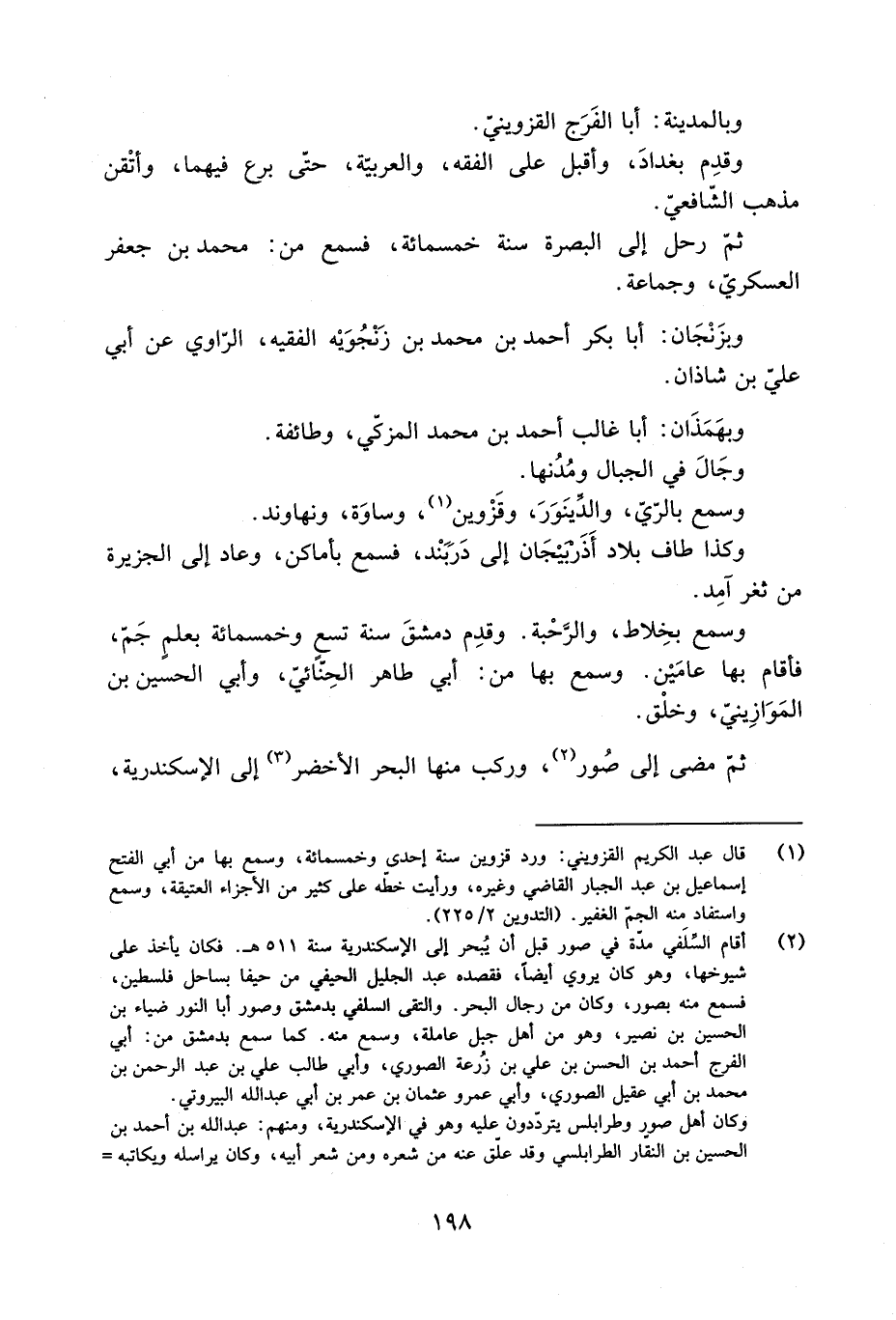 [2] أقام السّلفي مدّة في صور قبل أن يبحر إلى الإسكندرية سنة 511 هـ. فكان يأخذ على شيوخها، وهو كان يروي أيضا، فقصده عبد الجليل الحيفي من حيفا بساحل فلسطين، فسمع منه بصور، وكان من رجال البحر. والتقى السلفي بدمشق وصور أبا النور ضياء بن الحسين بن نصير، وهو من أهل جبل عاملة، وسمع منه. كما سمع بدمشق من: أبي الفرج أحمد بن الحسن بن علي بن زرعة الصوري، وأبي طالب علي بن عبد الرحمن بن محمد بن أبي عقيل الصوري، وأبي عمرو عثمان بن عمر بن أبي عبد الله البيروتي.