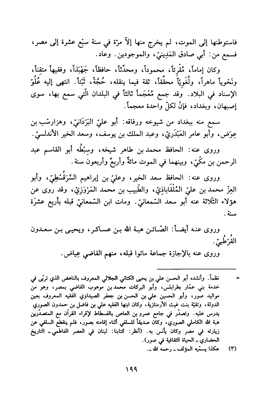 [ (-) ] نظما. وأنشده أبو الحسن علي بن يحيى الكتاني الجلالي المعروف بالناهض الّذي تربّى في خدمة بني عمّار بطرابلس، وأبو البركات محمد بن موهوب القاضي بمصر، وهو من مواليد صور، وأبو الحسين علي بن الحسن بن جعفر الصيداوي الفقيه المعروف بعين الدولة، وتقيّة بنت غيث الأرمنازية، وكان ابنها الفقيه علي بن فاضل بن حمدون الصوري يدرس عليه. وتصدّر في جامع عمرو بن العاص بالفسطاط لإقراء القرآن مع المتصدّرين هبة الله الكاملي الصوري، وكان صديقا للسلفي أثناء إقامته بصور، فلم ينقطع السلفي عن زيارته في مصر وكان يأنس به. (انظر: كتابنا: لبنان في العصر الفاطمي- التاريخ الحضاريّ- الحياة الثقافية في صور) .