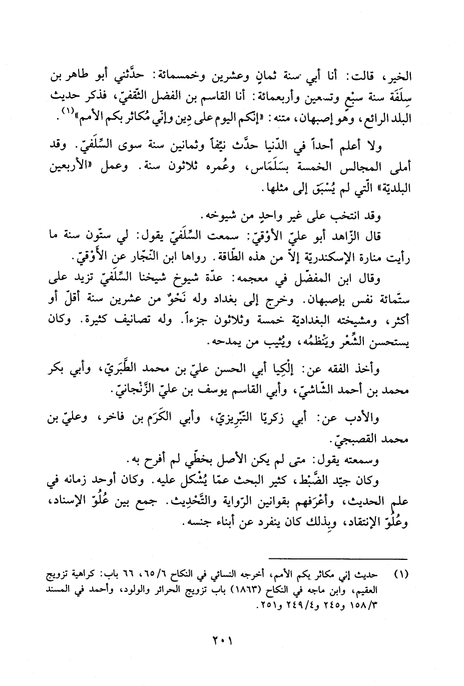 وقال ابْن المفضّل فِي معجمه: عدّة شيوخ شيخنا السّلفيّ تزيد على ستّمائة نفس بأصبهان. وخرج إلى بغداد وَلَهُ نحو من عشرين سنة أقلّ أو أكثر، ومشيخته البغداديّة خمسة وثلاثون جزءا. وَلَهُ تصانيف كثيرة. وكان يستحسن الشعْر ويَنْظمُه، ويُثيب من يمدحه.