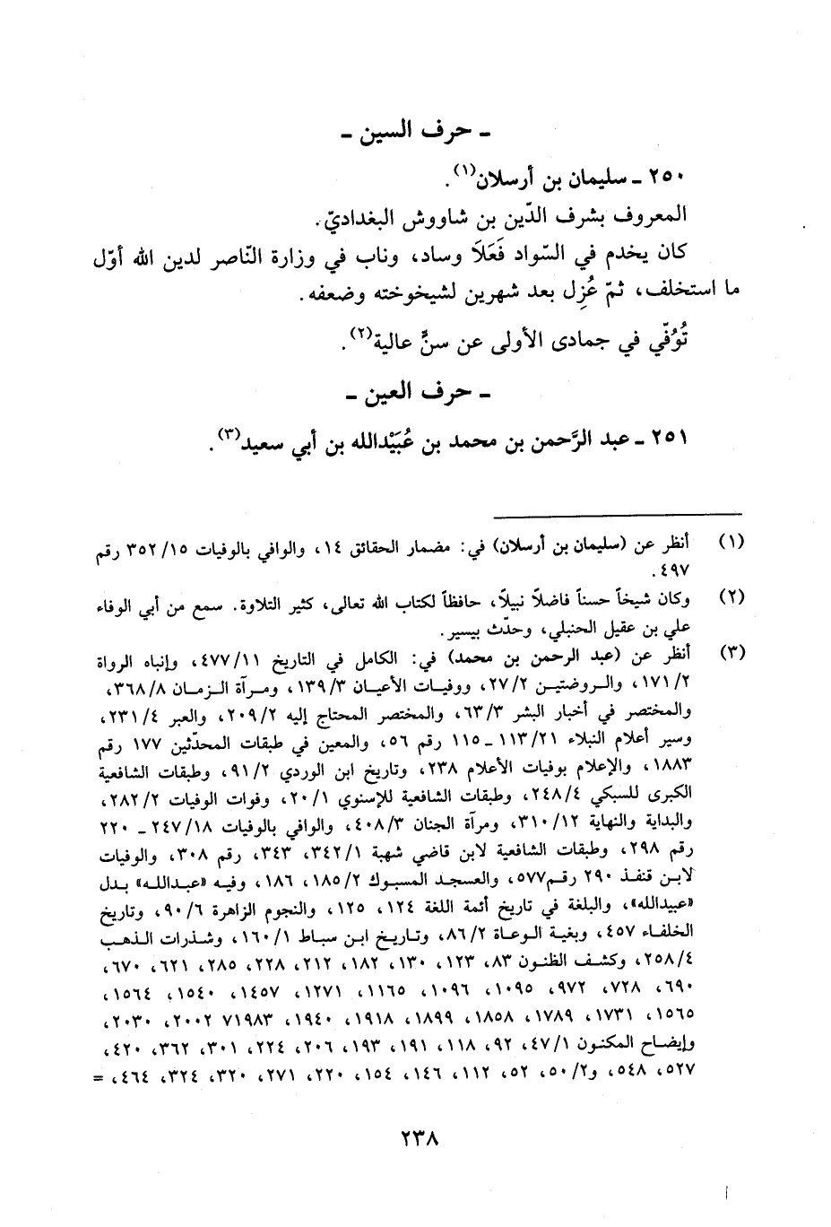 [3] انظر عن (عبد الرحمن بن محمد) في: الكامل في التاريخ 11/ 477، وإنباه الرواة 2/ 171، والروضتين 2/ 27، ووفيات الأعيان 3/ 139، ومرآة الزمان 8/ 368، والمختصر في أخبار البشر 3/ 63، والمختصر المحتاج إليه 2/ 209، والعبر 4/ 231، وسير أعلام النبلاء 21/ 113- 115 رقم 56، والمعين في طبقات المحدّثين 177 رقم 1883، والإعلام بوفيات الأعلام 238، وتاريخ ابن الوردي 2/ 91، وطبقات الشافعية الكبرى للسبكي 4/ 248، وطبقات الشافعية للإسنويّ 1/ 20، وفوات الوفيات 2/ 282، والبداية والنهاية 12/ 310، ومرآة الجنان 3/ 408، والوافي بالوفيات 18/ 247- 220 رقم 298، وطبقات الشافعية لابن قاضي شهبة 1/ 342، 343، رقم 308، والوفيات لابن قنفذ 290 رقم 577، والعسجد المسبوك 2/ 185، 186، وفيه «عبد الله» بدل «عبيد الله» ، والبلغة في تاريخ أئمة اللغة 124، 125، والنجوم الزاهرة 6/ 90، وتاريخ الخلفاء 457، وبغية الوعاة 2/ 86، وتاريخ ابن سباط 1/ 160، وشذرات الذهب 4/ 258، وكشف الظنون 83، 123، 130، 182، 212، 228، 285، 621، 670، 690، 728، 972، 1095، 1096، 1165، 1271، 1457، 1540، 1564، 1565، 1731، 1789، 1858، 1899، 1918، 1940، 1983، 2002، 2030، وإيضاح المكنون 1/ 47، 92، 118، 191، 193، 206، 224، 301، 362، 420، 527، 548، و 2/ 50، 52، 112، 146، 154، 220، 271، 320، 324، 464، -