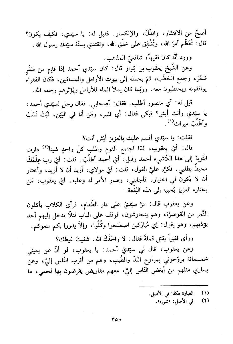 وعن يعقوب، قَالَ لي سيّديّ أَحْمَد: يا يعقوب، لو أنّ عن يميني خمسمائة يروّحوني بمراوح النّدّ والطّيب، وهم من أقرب النّاس إليّ، وعن يساري مثلهم من أبغض النّاس إليّ، معهم مقاريض يقرضون بها لحمي، ما