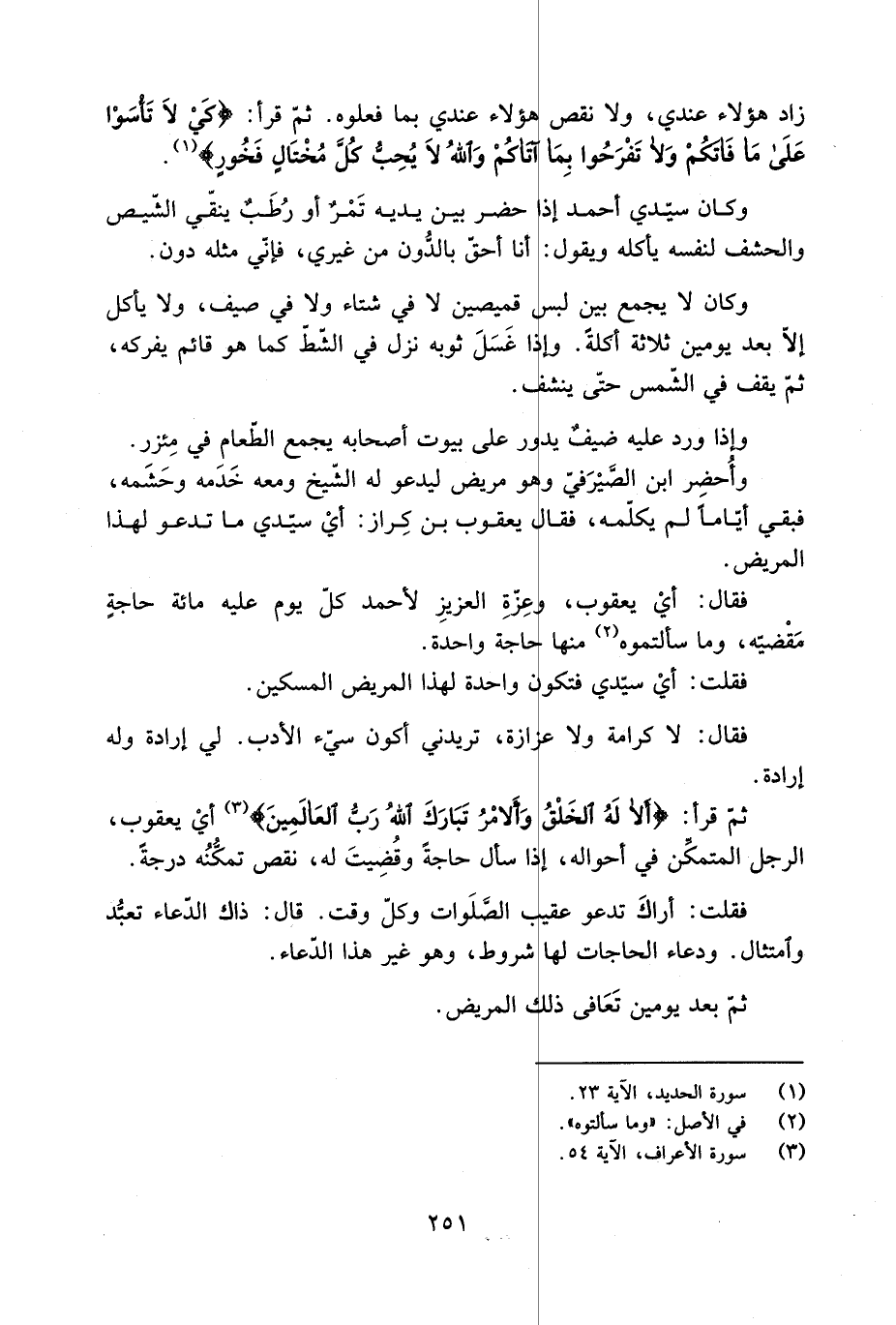 فقلت: أراكَ تدعو عقيب الصَّلَوات وكلّ وقت. قَالَ: ذاك الدّعاء تعبُّد وامتثال. ودعاء الحاجات لها شروط، وهو غير هذا الدّعاء.