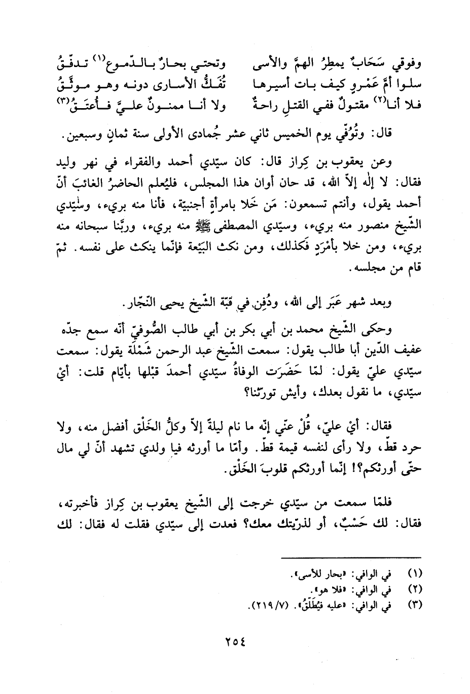 وعن يعقوب بْن كِراز قَالَ: كان سيّدي أَحْمَد والفقراء فِي نهر وليد فقال: لَا إله إلَّا اللَّه، قد حان أوان هذا المجلس، فليُعلم الحاضرُ الغائبَ أنْ أَحْمَد يقول، وأنتم تسمعون: مَن خَلا بامرأةٍ أجنبيّة، فأنا منه بريء، وسيّدي الشَّيْخ منصور منه بريء، وسيّدي المصطفى صَلَّى اللَّه عَلَيْهِ وَسَلَّمَ منه بريء، وربّنا سبحانه منه بريء، ومن خلا بأمْرَدٍ فَكذلك، ومن نكث البَيْعة فإنّما ينكث على نفسه. ثمّ قام من مجلسه.