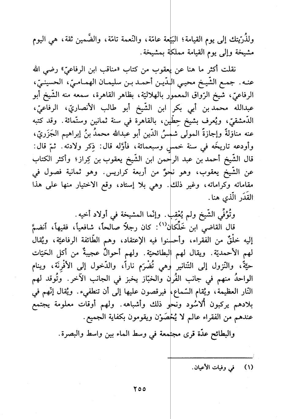 نقلت أكثر ما هنا عَن يعقوب من كِتَاب «مناقب ابْن الرفاعيّ» رضي اللَّه عنه. جمع الشَّيْخ محيي الدّين أَحْمَد بْن سُلَيْمَان الهماميّ، الحسينيّ، الرفاعيّ، شَيْخ الرّواق المعمور بالهلاليّة، بظاهر القاهرة، سمعه منه الشَّيْخ أَبُو عَبْد اللَّه مُحَمَّد بْن أَبِي بَكْر ابْن الشَّيْخ أَبُو طَالِب الْأَنْصَارِيّ، الرفاعيّ، الدّمشقيّ، ويُعرف بشيخ حِطين، بالقاهرة فِي سنة ثمانين وستّمائة. وقد كتبه عَنْهُ مناولة وإجازة المولى شمسُ الدّين أَبُو عَبْد اللَّه مُحَمَّد بْن إِبْرَاهِيم الجزريّ، وأودعه تاريخه في سنة خمس وسبعمائة، فأوّله قَالَ: ذِكر ولادته. ثمّ قَالَ: