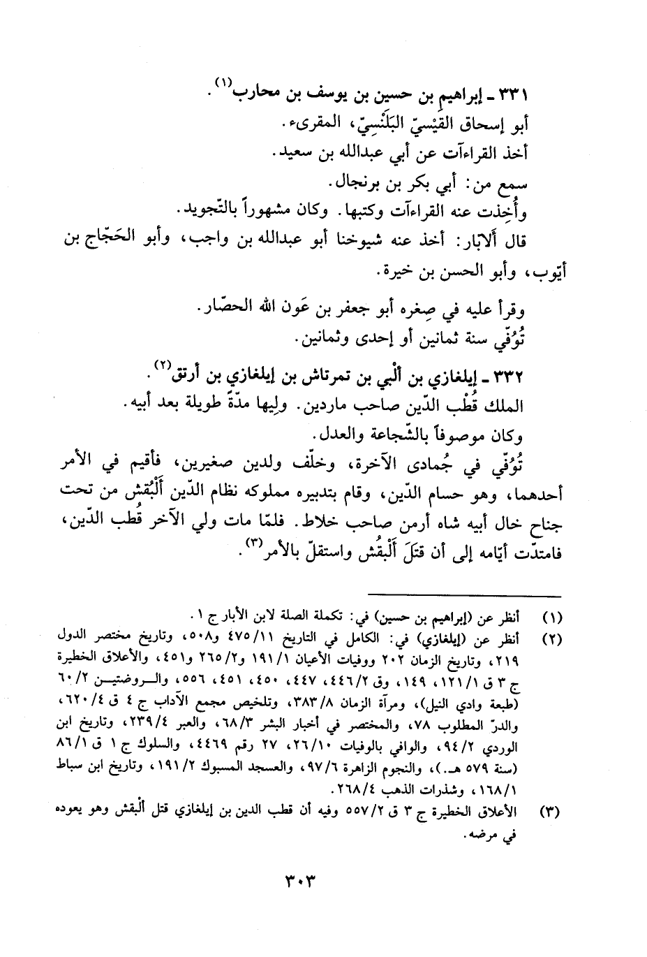 [2] انظر عن (إيلغازي) في: الكامل في التاريخ 11/ 475 و 508، وتاريخ مختصر الدول 219، وتاريخ الزمان 202 ووفيات الأعيان 1/ 191 و 2/ 265 و 451، والأعلاق الخطيرة ج 3 ق 1/ 121، 149، وق 2/ 446، 447، 450، 451، 556، والروضتين 2/ 60 (طبعة وادي النيل) ، ومرآة الزمان 8/ 383، وتلخيص مجمع الآداب ج 4 ق 4/ 620، والدرّ المطلوب 78، والمختصر في أخبار البشر 3/ 68، والعبر 4/ 239، وتاريخ ابن الوردي 2/ 94، والوافي بالوفيات 10/ 26، 27 رقم 4469، والسلوك ج 1 ق 1/ 86 (سنة 579 هـ.) ، والنجوم الزاهرة 6/ 97، والعسجد المسبوك 2/ 191، وتاريخ ابن سباط 1/ 168، وشذرات الذهب 4/ 268.