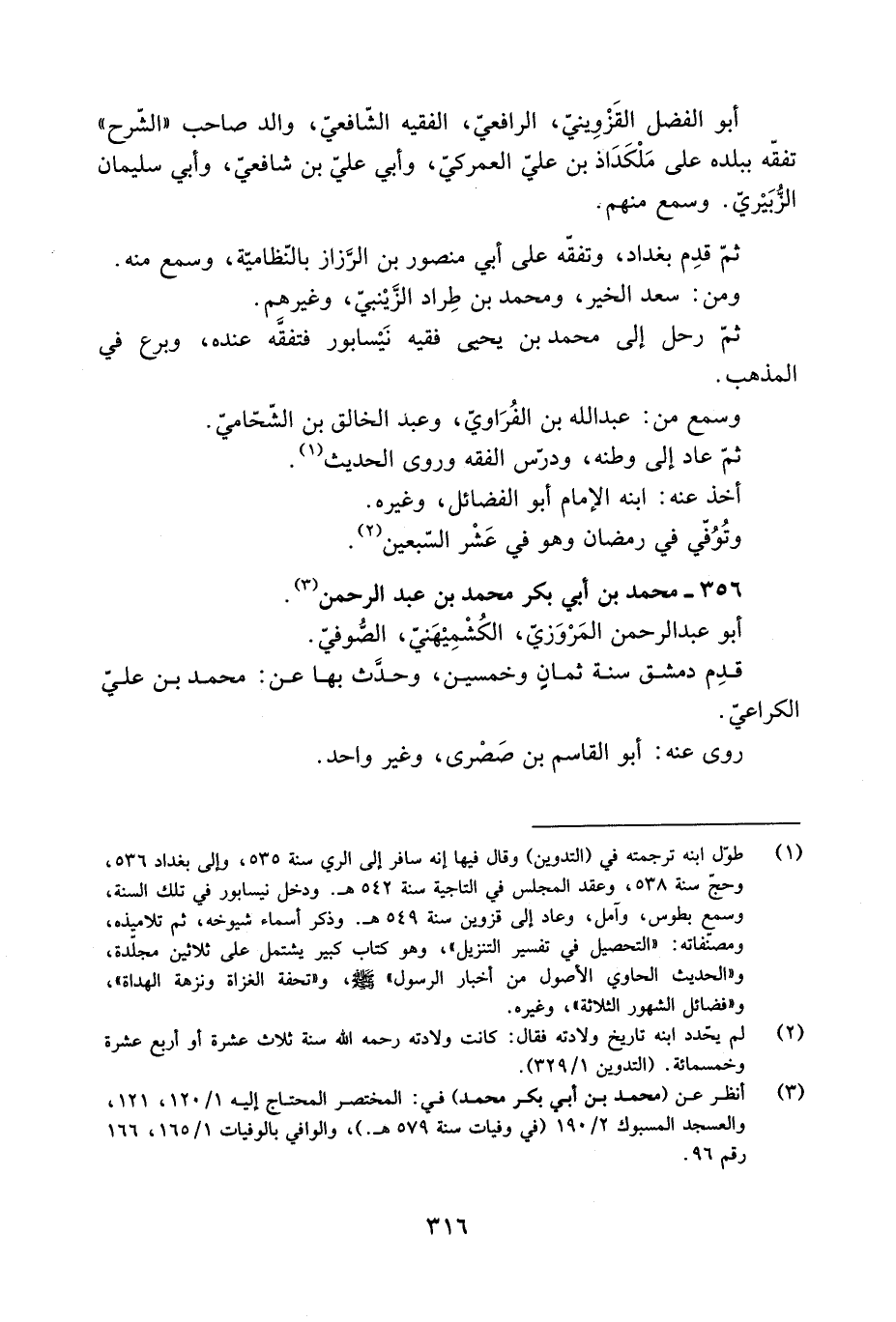 [1] طوّل ابنه ترجمته في (التدوين) وقال فيها إنه سافر إلى الري سنة 535، وإلى بغداد 536، وحجّ سنة 538، وعقد المجلس في التاجية سنة 542 هـ. ودخل نيسابور في تلك السنة، وسمع بطوس، وآمل، وعاد إلى قزوين سنة 549 هـ. وذكر أسماء شيوخه، ثم تلاميذه، ومصنّفاته: «التحصيل في تفسير التنزيل» ، وهو كتاب كبير يشتمل على ثلاثين مجلّدة، و «الحديث الحاوي الأصول من أخبار الرسول» صلّى الله عليه وسلم، و «تحفة الغزاة ونزهة الهداة» ، و «فضائل الشهور الثلاثة» ، وغيره.