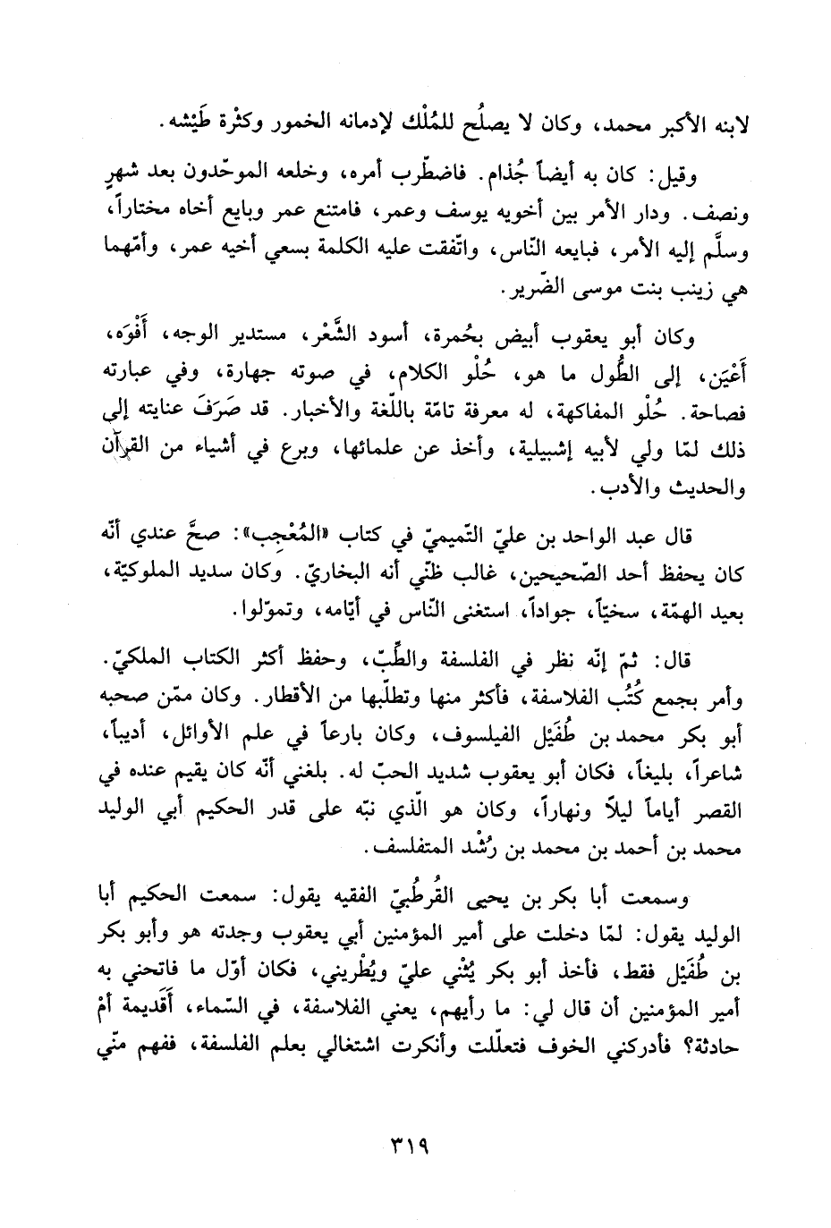 وأمر بجمع كُتُب الفلاسفة، فأكثر منها وتطلّبها من الأقطار. وكان ممّن صحبه أَبُو بَكْر مُحَمَّد بْن طُفَيْل الفيلسوف، وكان بارعا فِي علم الأوائل، أديبا، شاعرا، بليغا، فكان أَبُو يعقوب شديد الحبّ لَهُ. بلغني أنّه كان يقيم عنده فِي القصر أياما ليلا ونهارا، وكان هُوَ الَّذِي نبّه على قدر الحكيم أَبِي الوليد مُحَمَّد بْن أَحْمَد بْن مُحَمَّد بْن رُشْد المتفلسف.